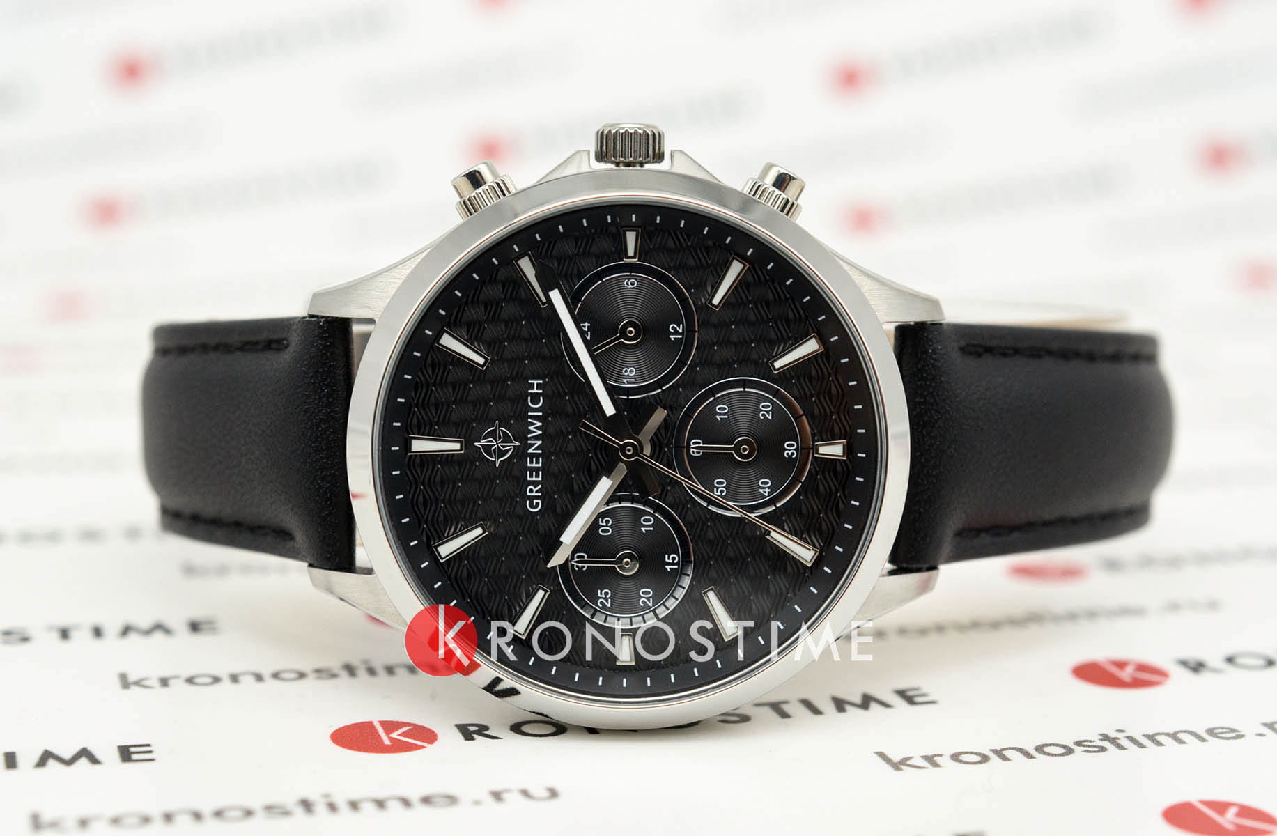 Женские кварцевые часы Greenwich из коллекции Mermaid — это сочетание элегантности и функциональности. Корпус диаметром 35 мм выполнен из нержавеющей стали. Циферблат чёрного цвета оформлен с эффектом гильоше в виде волнообразных линий, придающим ему объём и глубину. На циферблате расположены субциферблаты хронографа (секундомер на 60 секунд и 30 минут) и индикатор 24-часового формата. Все индикаторы выделены рамками с зеркальной полировкой. Стрелки и метки с люминесцентным покрытиемЛюминесцентное покрытиеПозволяет считывать показания времени в темноте. Производители наносят на стрелки, часовые индексы, безель или поверхность циферблата светонакопительный состав, дающий холодное свечение., обеспечивающим хорошую читаемость в темноте. Циферблат защищён минеральным стекломМинеральное стеклоМинеральное стекло представляет собой искусственно выращенный минерал кварца. Такое стекло отличается особой устойчивостью к повреждениям и царапинам. Уступает по некоторым качествам сапфировому стеклу.. Механизм — кварцевый калибр Miyota с функцией хронографа. Часы оснащены кожаным ремешком чёрного цвета с классической пряжкой из нержавеющей стали. Водонепроницаемость 100 м позволяет использовать часы для плавания и повседневного ношения. Гарантия — 24 месяца. Идеальный выбор для тех, кто ценит стиль, точность и надёжность.