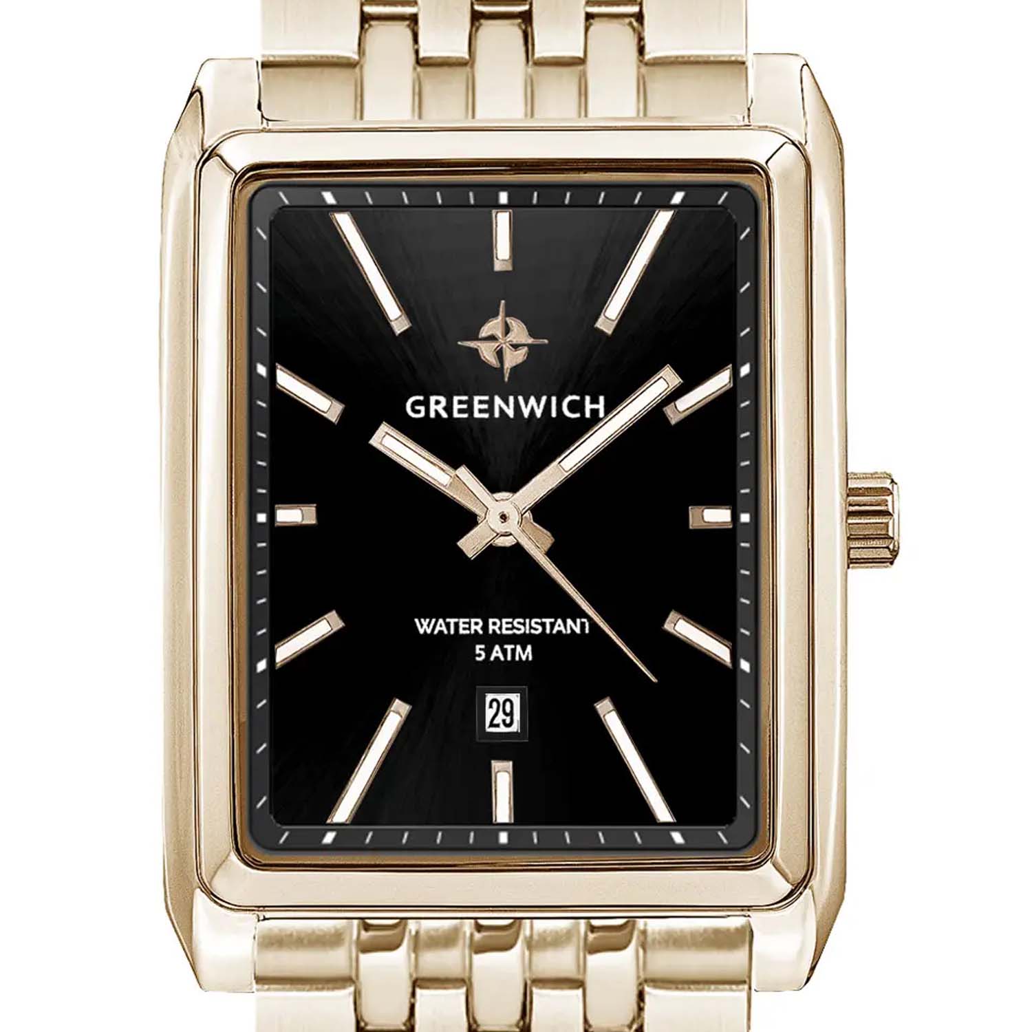 Часы Greenwich GW 541.40.11 из коллекции Galeon — элегантная мужская модель, сочетающая классический дизайн и современные технологии. Корпус размером 33 x 40 мм выполнен из нержавеющей стали с PVD-покрытиемPVDУльтратонкое покрытие наносится в технике вакуумного напыления, сочетает в себе нитрид титана особой прочности со слоем золота или оксида хрома. Несёт в себе декоративную или защитную функцию. розового золота. Чёрный циферблат с полировкой «солнечные лучи» оснащён крупными стрелками с люминесцентным покрытием для удобного считывания времени в условиях низкой освещённости и защищён минеральным стекломМинеральное стеклоМинеральное стекло представляет собой искусственно выращенный минерал кварца. Такое стекло отличается особой устойчивостью к повреждениям и царапинам. Уступает по некоторым качествам сапфировому стеклу.. Модель оснащена кварцевым механизмом Miyota, обеспечивающим высокую точность хода. На циферблате расположено окно даты в позиции «6 часов». Водозащита до 5 ATM (50 метров) делает часы подходящими для повседневного использования, включая умывание и случайные брызги. Металлический браслет с раскладной застёжкойРаскладная застёжкаТакой тип застёжки используется только на браслетах из металла. Она никогда не раскрывается полностью, происходит разделение на 2 и более частей. Раскладывающая застёжка снизит вероятность потери часов к минимуму. и PVD-покрытиемPVDУльтратонкое покрытие наносится в технике вакуумного напыления, сочетает в себе нитрид титана особой прочности со слоем золота или оксида хрома. Несёт в себе декоративную или защитную функцию. розового золота обеспечивает комфортное ношение и надёжную фиксацию на запястье. Эта модель гармонично сочетает традиционный стиль и современные элементы, подходя как для деловых встреч, так и для повседневного ношения.