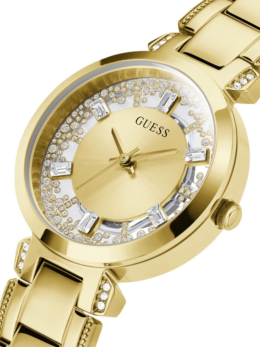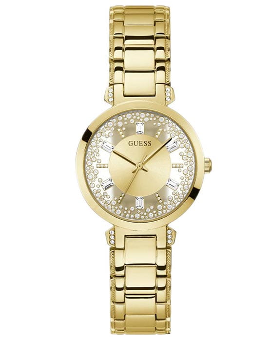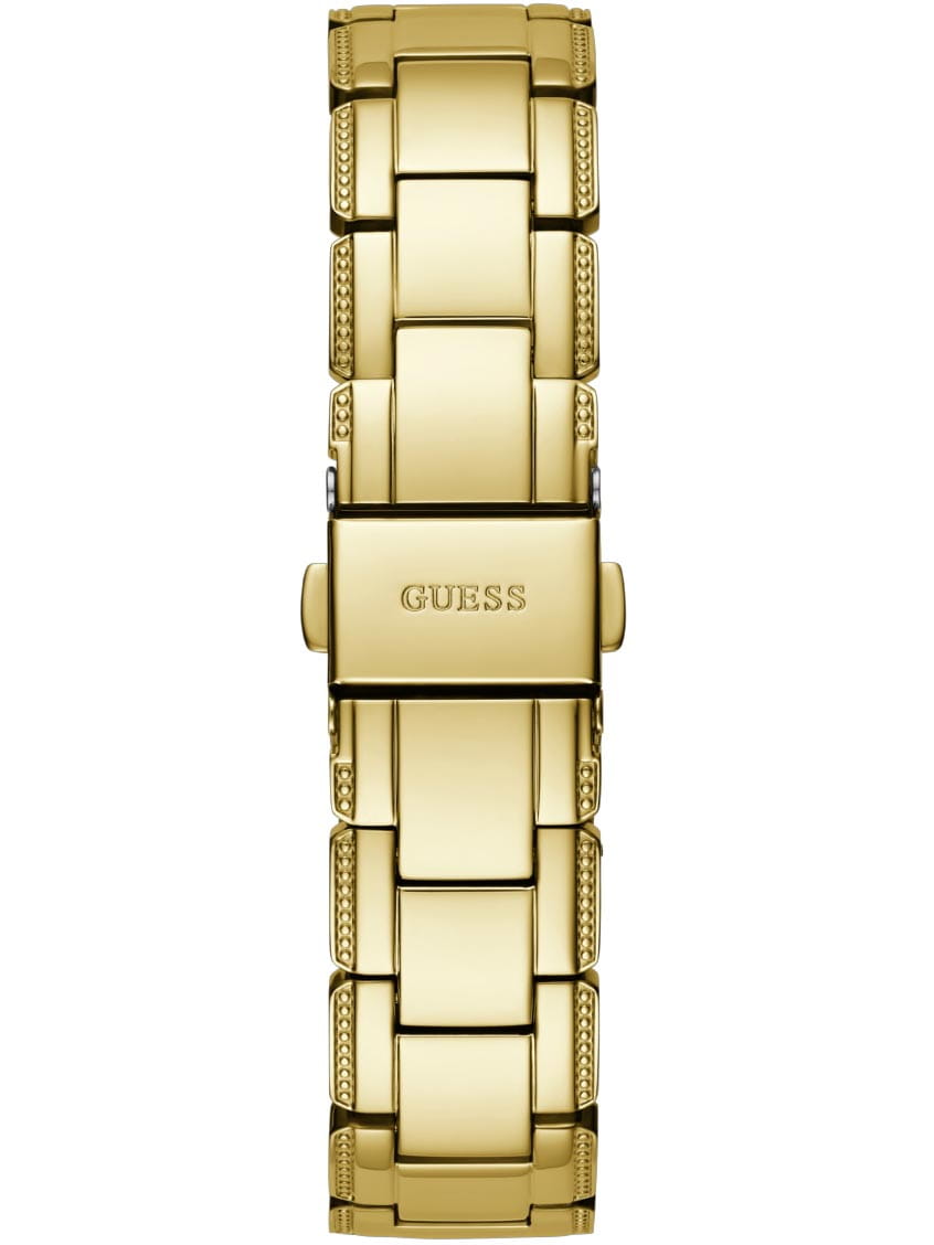 Женские наручные часы Guess GW0470L2 с минеральным стекломМинеральное стеклоМинеральное стекло представляет собой искусственно выращенный минерал кварца. Такое стекло отличается особой устойчивостью к повреждениям и царапинам. Уступает по некоторым качествам сапфировому стеклу., кварцевый механизм с высокой точностью. Класс водозащиты: 30 метров, позволит защитить корпус от случайных брызг или капель дождя. Корпус часов изготовлен из стали с IP-покрытиемIP-покрытиеМетод ионного напыления. Демонстрирует повышенную устойчивость к истиранию, окислению и химическим веществам. Под воздействием высокого давления и температуры около 1500°C молекулы металла надёжно соединяются с частицами корпуса часов.. Браслет с раскладной застёжкойРаскладная застёжкаТакой тип застёжки используется только на браслетах из металла. Она никогда не раскрывается полностью, происходит разделение на 2 и более частей. Раскладывающая застёжка снизит вероятность потери часов к минимуму.
