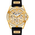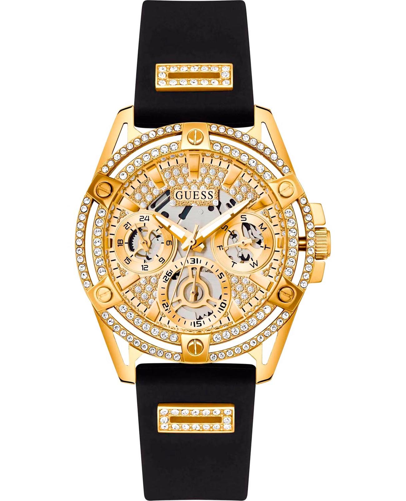 Женские наручные часы-скелетоны с минеральным стекломМинеральное стеклоМинеральное стекло представляет собой искусственно выращенный минерал кварца. Такое стекло отличается особой устойчивостью к повреждениям и царапинам. Уступает по некоторым качествам сапфировому стеклу. Guess Queen GW0536L3, кварцевый механизм с высокой точностью. Класс водозащиты: 30 метров, позволит защитить корпус от случайных брызг или капель дождя. Корпус часов изготовлен из стали с IP-покрытиемIP-покрытиеМетод ионного напыления. Демонстрирует повышенную устойчивость к истиранию, окислению и химическим веществам. Под воздействием высокого давления и температуры около 1500°C молекулы металла надёжно соединяются с частицами корпуса часов.. Силиконовый ремешок на стандартной застёжке. 24-х часовой формат времени, дата и день недели вынесены на отдельные циферблаты. Метки в виде штрихов. Рифленая заводная головка с защитой. Циферблат и ремешок украшены кристаллами.