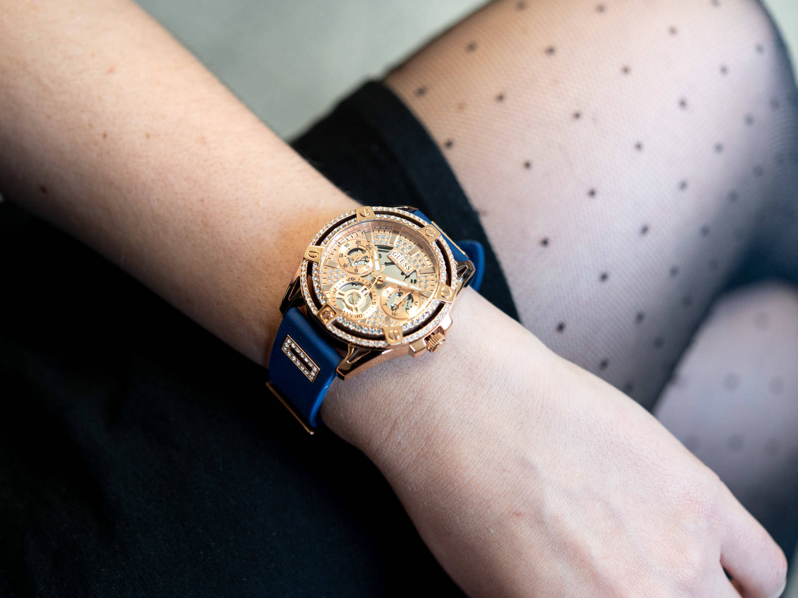 Женские наручные часы-скелетоны с минеральным стекломМинеральное стеклоМинеральное стекло представляет собой искусственно выращенный минерал кварца. Такое стекло отличается особой устойчивостью к повреждениям и царапинам. Уступает по некоторым качествам сапфировому стеклу. Guess Queen GW0536L5, кварцевый механизм с высокой точностью. Класс водозащиты: 30 метров, позволит защитить корпус от случайных брызг или капель дождя. Корпус часов изготовлен из стали с IP-покрытиемIP-покрытиеМетод ионного напыления. Демонстрирует повышенную устойчивость к истиранию, окислению и химическим веществам. Под воздействием высокого давления и температуры около 1500°C молекулы металла надёжно соединяются с частицами корпуса часов.. Силиконовый ремешок на стандартной застёжке. 24-х часовой формат времени, дата и день недели вынесены на отдельные циферблаты. Метки в виде штрихов. Рифленая заводная головка с защитой. Циферблат и ремешок украшены кристаллами.
