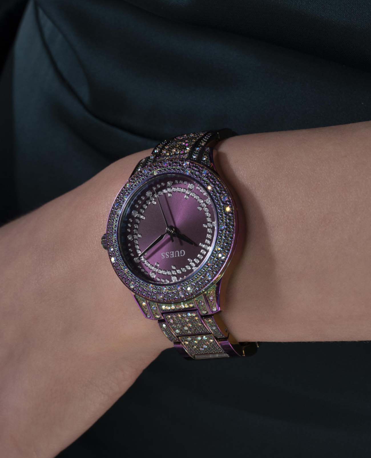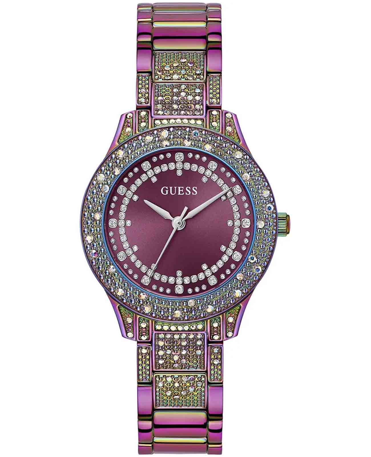 Женские наручные часы с минеральным стекломМинеральное стеклоМинеральное стекло представляет собой искусственно выращенный минерал кварца. Такое стекло отличается особой устойчивостью к повреждениям и царапинам. Уступает по некоторым качествам сапфировому стеклу. Guess Trend GW0746L3, кварцевый механизм с высокой точностью. Корпус часов изготовлен из стали с IP-покрытиемIP-покрытиеМетод ионного напыления. Демонстрирует повышенную устойчивость к истиранию, окислению и химическим веществам. Под воздействием высокого давления и температуры около 1500°C молекулы металла надёжно соединяются с частицами корпуса часов.. БезельБезельВнешний ободок, закрепляющий стекло. В спортивных часах так называется поворотное кольцо с делениями на циферблате, выполняет роль таймера – замеряет отрезки времени на шкале. Неподвижный безель – элемент декора. Однонаправленно вращающийся безель на дайверских часах позволяет фиксировать моменты погружения и выныривания на поверхность. из стали с IP-покрытиемIP-покрытиеМетод ионного напыления. Демонстрирует повышенную устойчивость к истиранию, окислению и химическим веществам. Под воздействием высокого давления и температуры около 1500°C молекулы металла надёжно соединяются с частицами корпуса часов., корпус и циферблат украшены кристаллами. Класс водозащиты: 30 метров, позволит защитить корпус от случайных брызг или капель дождя. Стальной браслет с IP-покрытиемIP-покрытиеМетод ионного напыления. Демонстрирует повышенную устойчивость к истиранию, окислению и химическим веществам. Под воздействием высокого давления и температуры около 1500°C молекулы металла надёжно соединяются с частицами корпуса часов. на раскладной застёжкеРаскладная застёжкаТакой тип застёжки используется только на браслетах из металла. Она никогда не раскрывается полностью, происходит разделение на 2 и более частей. Раскладывающая застёжка снизит вероятность потери часов к минимуму..
