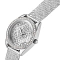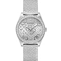 Женские наручные часы с минеральным стекломМинеральное стеклоМинеральное стекло представляет собой искусственно выращенный минерал кварца. Такое стекло отличается особой устойчивостью к повреждениям и царапинам. Уступает по некоторым качествам сапфировому стеклу. Guess Trend GW0748L1, кварцевый механизм с высокой точностью. Корпус часов изготовлен из стали. БезельБезельВнешний ободок, закрепляющий стекло. В спортивных часах так называется поворотное кольцо с делениями на циферблате, выполняет роль таймера – замеряет отрезки времени на шкале. Неподвижный безель – элемент декора. Однонаправленно вращающийся безель на дайверских часах позволяет фиксировать моменты погружения и выныривания на поверхность. и циферблат украшены кристаллами. Стрелки с люминесцентным покрытиемЛюминесцентное покрытиеПозволяет считывать показания времени в темноте. Производители наносят на стрелки, часовые индексы, безель или поверхность циферблата светонакопительный состав, дающий холодное свечение.. Класс водозащиты: 30 метров, позволит защитить корпус от случайных брызг или капель дождя. Стальной браслет миланского плетения на раскладном замкеРаскладной замокДанный вариант застежки используется только на часах с металлическим браслетом. Отличительная особенность такого крепления в том, что длина браслета становится универсальной и вы можете самостоятельно отрегулировать нужный вам размер – застежка просто двигается по браслету часов..