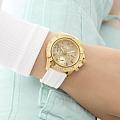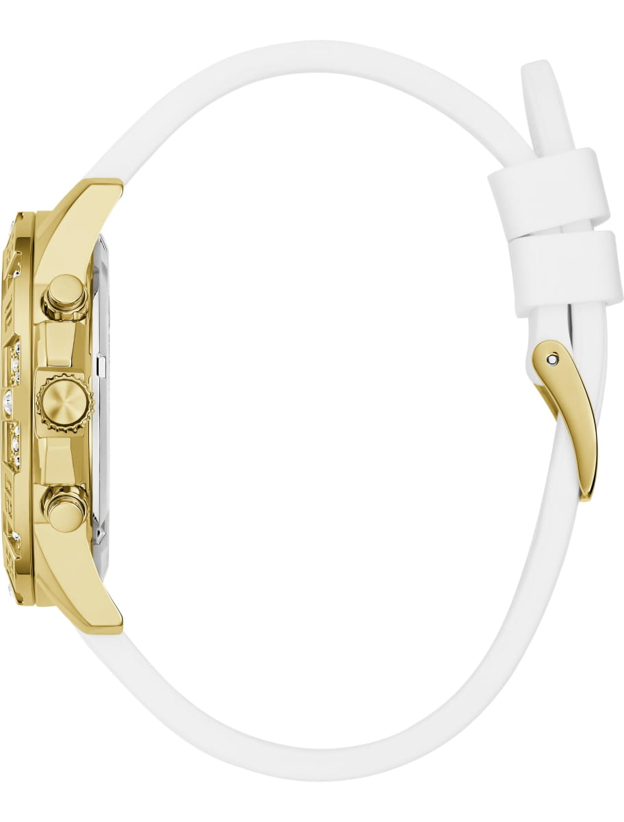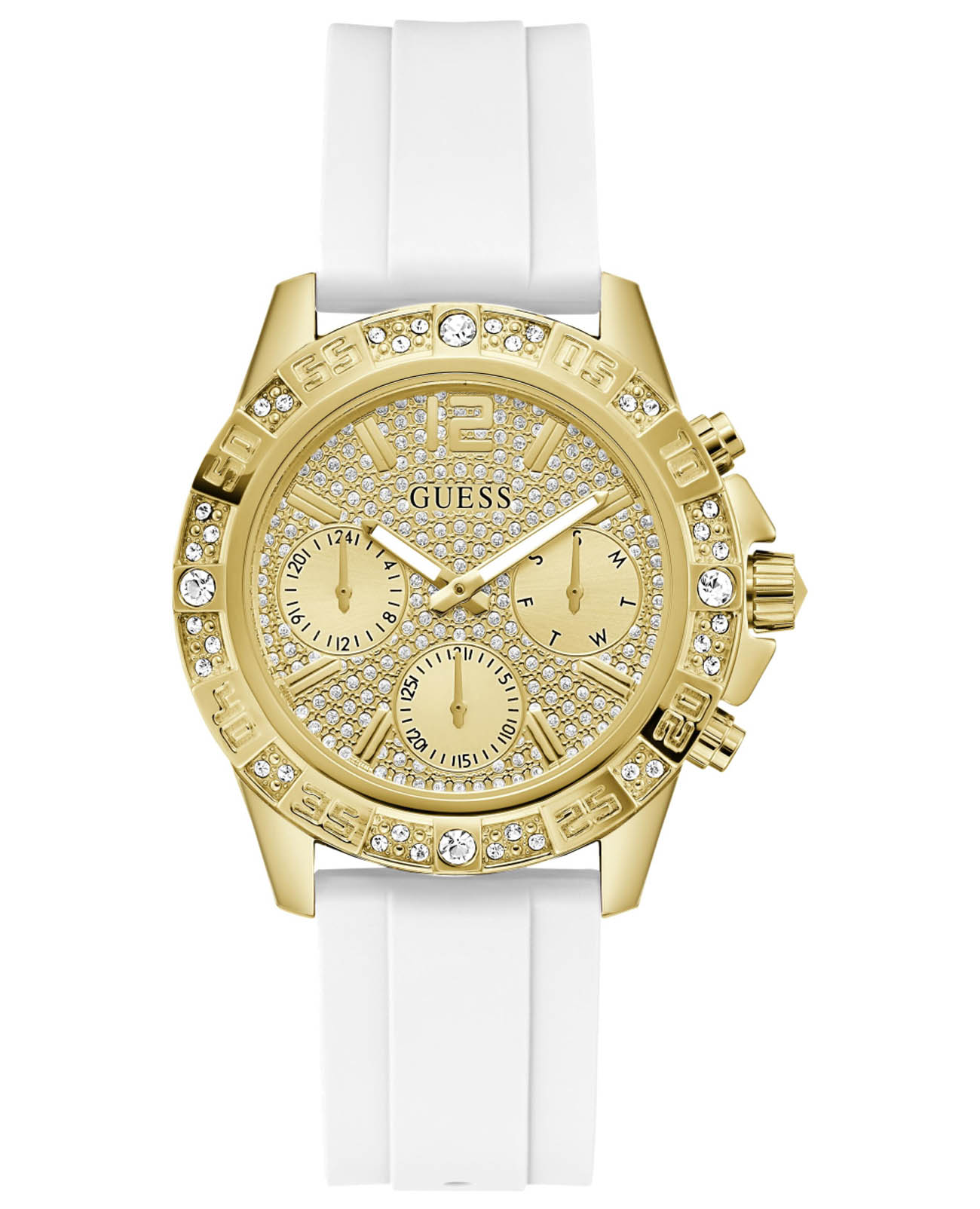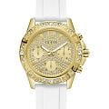 Женские наручные часы Guess Dress GW0771L2 с минеральным стекломМинеральное стеклоМинеральное стекло представляет собой искусственно выращенный минерал кварца. Такое стекло отличается особой устойчивостью к повреждениям и царапинам. Уступает по некоторым качествам сапфировому стеклу., кварцевый механизм с высокой точностью. Корпус часов изготовлен из стали с PVD-покрытиемPVDУльтратонкое покрытие наносится в технике вакуумного напыления, сочетает в себе нитрид титана особой прочности со слоем золота или оксида хрома. Несёт в себе декоративную или защитную функцию.. БезельБезельВнешний ободок, закрепляющий стекло. В спортивных часах так называется поворотное кольцо с делениями на циферблате, выполняет роль таймера – замеряет отрезки времени на шкале. Неподвижный безель – элемент декора. Однонаправленно вращающийся безель на дайверских часах позволяет фиксировать моменты погружения и выныривания на поверхность. с PVD-покрытиемPVDУльтратонкое покрытие наносится в технике вакуумного напыления, сочетает в себе нитрид титана особой прочности со слоем золота или оксида хрома. Несёт в себе декоративную или защитную функцию. украшен кристаллами. Стрелки с люминесцентным покрытиемЛюминесцентное покрытиеПозволяет считывать показания времени в темноте. Производители наносят на стрелки, часовые индексы, безель или поверхность циферблата светонакопительный состав, дающий холодное свечение.. Класс водозащиты: 50 метров, позволит защитить корпус от случайных брызг или капель дождя. Силиконовый ремешок с простой ремешковой застежкой.