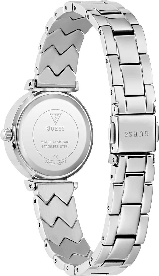 Женские наручные часы Guess Dress GW0839L4 с минеральным стекломМинеральное стеклоМинеральное стекло представляет собой искусственно выращенный минерал кварца. Такое стекло отличается особой устойчивостью к повреждениям и царапинам. Уступает по некоторым качествам сапфировому стеклу., кварцевый механизм с высокой точностью. Корпус часов изготовлен из стали. Циферблат украшен кристаллами. Класс водозащиты: 30 метров, позволит защитить корпус от случайных брызг или капель дождя. Металлический браслет на раскладной застежке.