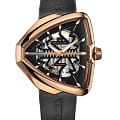 В смелом дизайне Ventura Elvis80 Skeleton отражено прошлое, настоящее и будущее первых в мире электрических часов. Эффектная интерпретация революционной модели, эта модель имеет скелетонизированный циферблат с впечатляющим зигзагом в центре, который сочетается с сияющим треугольным корпусом из розового золота с PVD-покрытием. Деталь в форме молнии воспевает легендарный символ новаторства и привлекает внимание к расположенному ниже механизму с автоматическим подзаводом H-10-S.