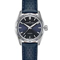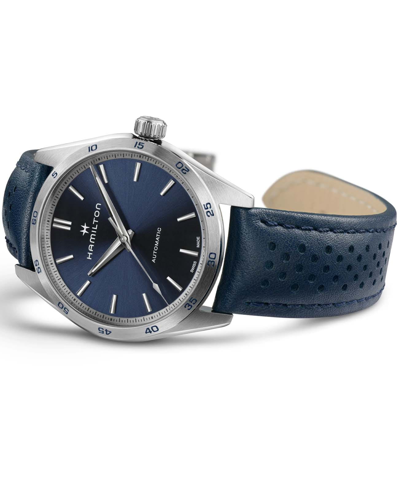 Модели из линии Jazzmaster Performer, привлекающие внимание ярким дизайном в стиле спортивный шик, сочетают в себе функциональность и эстетичность. Часы Jazzmaster Performer Automatic оснащены автоматическим механизмом H-10 с 80-часовым запасом хода. Модель в корпусе из нержавеющей стали диаметром 34 мм имеет лаконичный синий циферблат из нержавеющей стали и сочетающийся с ним перфорированный синий кожаный ремешок в гоночном стиле. Сапфировое стеклоСапфировое стеклоПрочный и надёжный материал из кристалла сапфира синтетического происхождения, характеризующийся особой твёрдостью и устойчивостью к царапинам и повреждениям. с антибликовым покрытием. Кожаный ремешок на стандартной застёжке. Стрелки и метки с люминесцентным покрытиемЛюминесцентное покрытиеПозволяет считывать показания времени в темноте. Производители наносят на стрелки, часовые индексы, безель или поверхность циферблата светонакопительный состав, дающий холодное свечение..