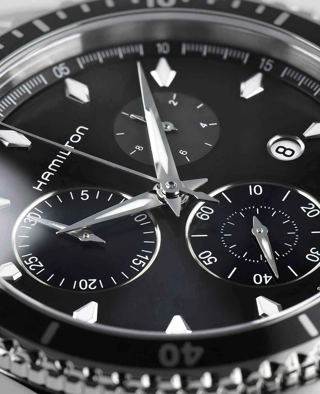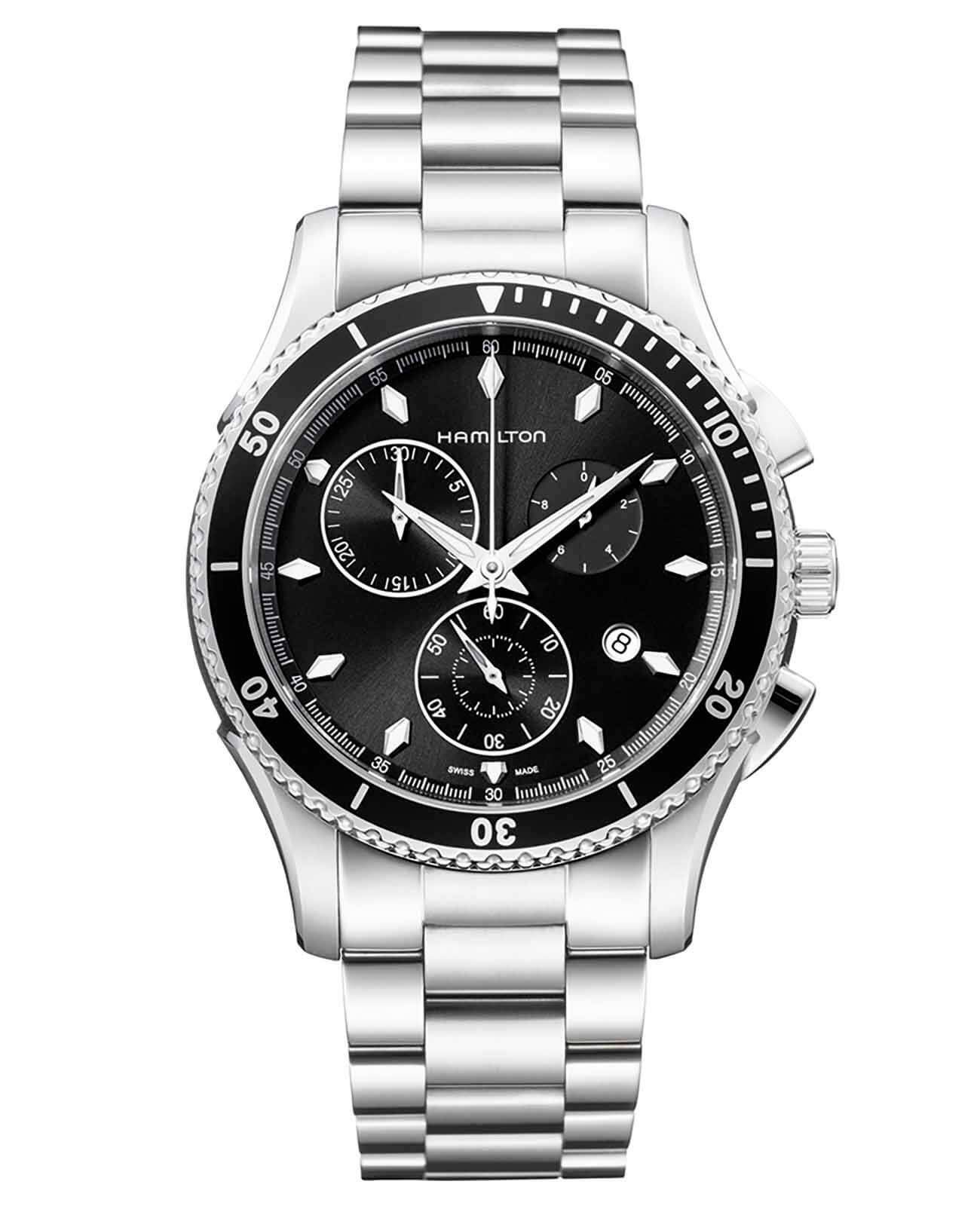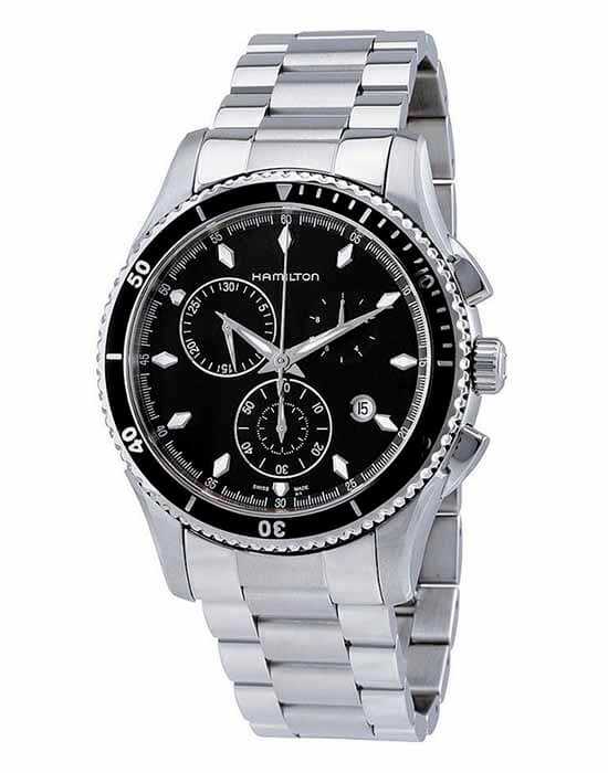 Мужские швейцарские часы Hamilton Jazzmaster Seaview Chrono Quartz H37512131, кварцевый механизм с высокой точностью. Сапфировое стеклоСапфировое стеклоПрочный и надёжный материал из кристалла сапфира синтетического происхождения, характеризующийся особой твёрдостью и устойчивостью к царапинам и повреждениям. устойчивое к появлению царапин, обладающее высокой прозрачностью. Класс водозащиты: 100 метров, позволит плавать, нырять и заниматься другими водными видами спорта. Корпус часов изготовлен из нержавеющей стали. Стрелки и метки с люминесцентным покрытиемЛюминесцентное покрытиеПозволяет считывать показания времени в темноте. Производители наносят на стрелки, часовые индексы, безель или поверхность циферблата светонакопительный состав, дающий холодное свечение..