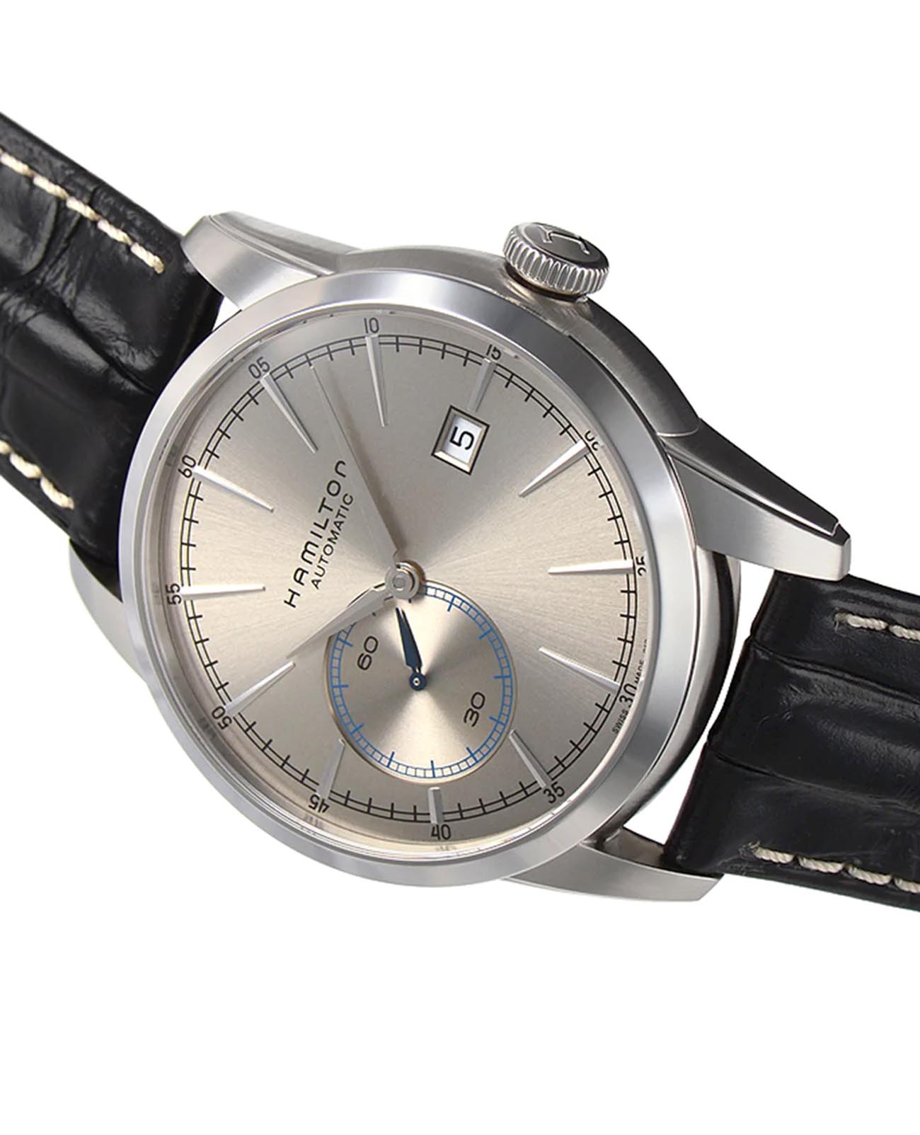 Мужские швейцарские часы с автоподзаводом Hamilton American Classic Railroad Small Second Auto H40515781. Сапфировое стеклоСапфировое стеклоПрочный и надёжный материал из кристалла сапфира синтетического происхождения, характеризующийся особой твёрдостью и устойчивостью к царапинам и повреждениям. устойчивое к мелким механическим повреждениям. Корпус часов изготовлен из нержавеющей стали. Кожаный ремешок с раскладной застёжкойРаскладная застёжкаТакой тип застёжки используется только на браслетах из металла. Она никогда не раскрывается полностью, происходит разделение на 2 и более частей. Раскладывающая застёжка снизит вероятность потери часов к минимуму.. Класс водозащиты: 50 метров, позволит защитить корпус от случайных брызг или капель дождя. Окошко даты находится в положении 3 часа.