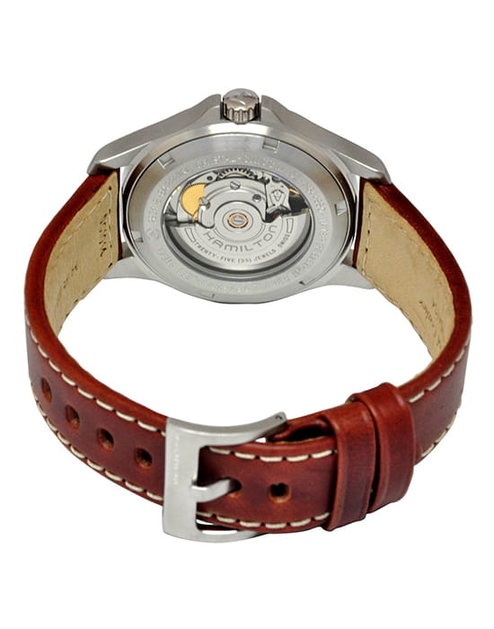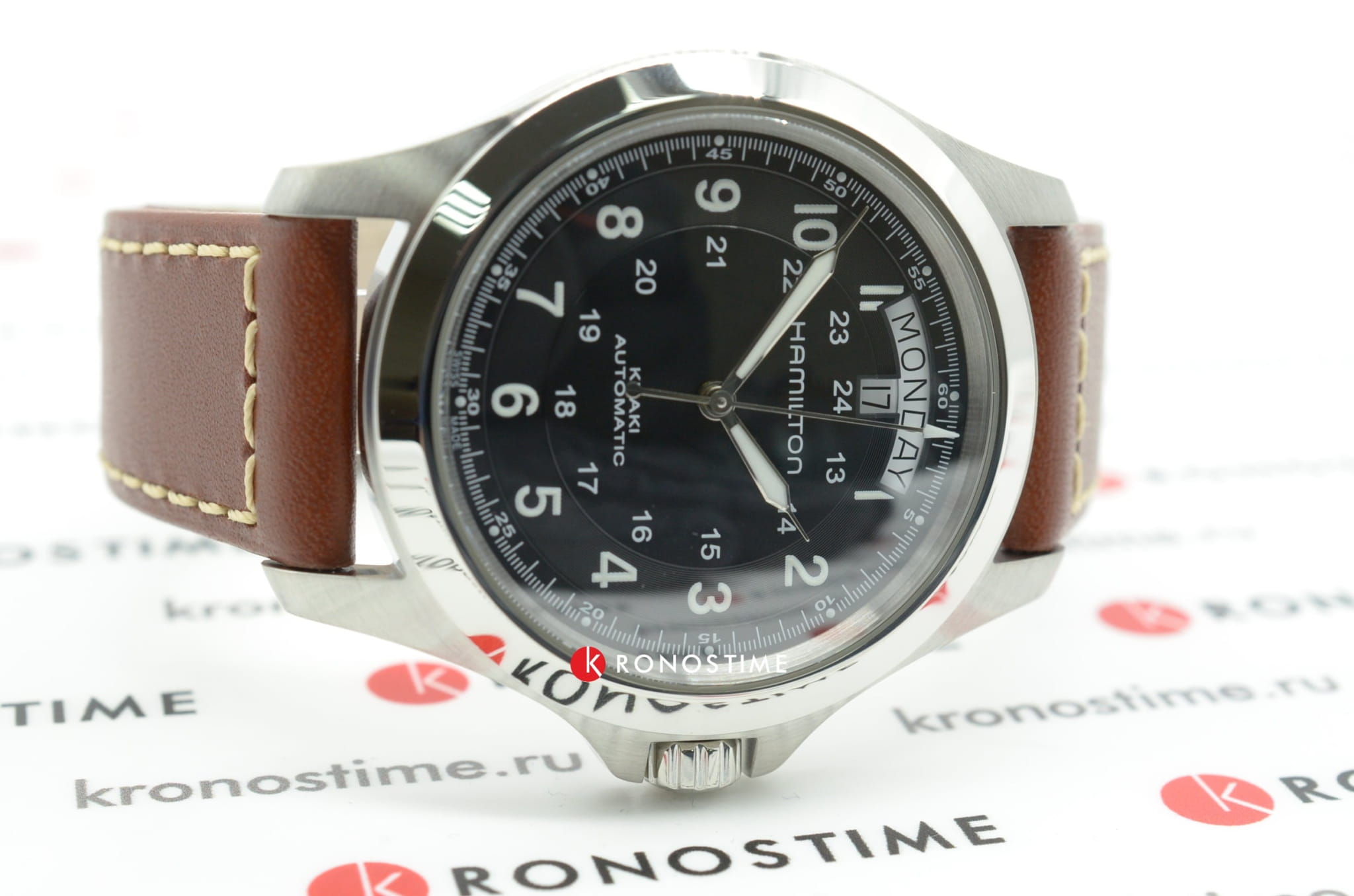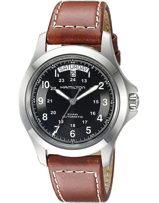Мужские швейцарские механические часы Hamilton Khaki Field King Auto H64455533, автоматический механизм с высокой точностью. Сапфировое стеклоСапфировое стеклоПрочный и надёжный материал из кристалла сапфира синтетического происхождения, характеризующийся особой твёрдостью и устойчивостью к царапинам и повреждениям. устойчивое к появлению царапин, обладающее высокой прозрачностью. Класс водозащиты: 50 метров, позволит защитить корпус от случайных брызг или капель дождя. Корпус часов изготовлен из стали. Кожаный ремешок. Стрелки с люминесцентным покрытиемЛюминесцентное покрытиеПозволяет считывать показания времени в темноте. Производители наносят на стрелки, часовые индексы, безель или поверхность циферблата светонакопительный состав, дающий холодное свечение..