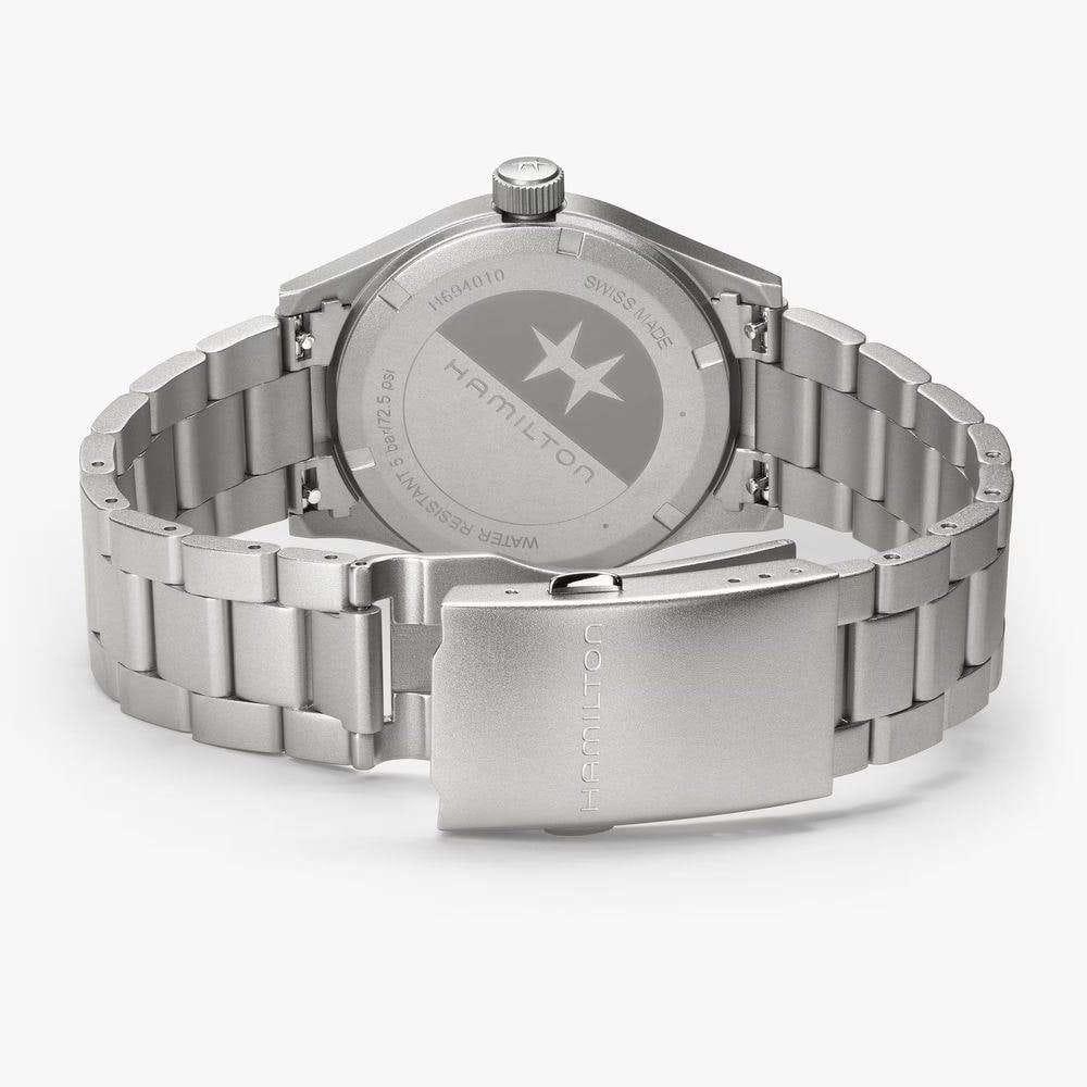 Hamilton Khaki Field Quartz H69401131 — компактные и универсальные часы в классическом военном стиле, с акцентом на надёжность и практичность. Корпус диаметром 38 мм выполнен из нержавеющей стали с сатинированной поверхностью. Он лёгкий, удобный и идеально подходит для запястий любого размера. Циферблат защищён сапфировым стекломСапфировое стеклоПрочный и надёжный материал из кристалла сапфира синтетического происхождения, характеризующийся особой твёрдостью и устойчивостью к царапинам и повреждениям. с антибликовым покрытиемАнтибликовое покрытиеСлой оксида металла в 0,13-0,3 микрон, благодаря которому стекло часов не бликует и не отражает свет. Антибликовое покрытие уменьшает отражение света в 10 раз, обеспечивая отличную читаемость показателей циферблата., устойчивым к царапинам и бликам. Циферблат оформлен в классическом армейском стиле: крупные арабские цифры, 24-часовая шкала по внутреннему кругу, стрелки и метки с люминесцентным покрытиемЛюминесцентное покрытиеПозволяет считывать показания времени в темноте. Производители наносят на стрелки, часовые индексы, безель или поверхность циферблата светонакопительный состав, дающий холодное свечение. для удобного считывания в темноте. Внутри установлен швейцарский кварцевый калибр ETA F05.105mh2 с функцией EOL-индикацииEOLПредставляет собой систему, уведомляющую владельца часов о необходимости замены элемента питания. За 2 недели до полного разряда батарейки секундная стрелка перестаёт ходить чётко и начинает перепрыгивать на 3-4 деления. — предупреждением о скором разряде батареи. Модель укомплектована браслетом из нержавеющей стали с раскладной застёжкойРаскладная застёжкаТакой тип застёжки используется только на браслетах из металла. Она никогда не раскрывается полностью, происходит разделение на 2 и более частей. Раскладывающая застёжка снизит вероятность потери часов к минимуму., обеспечивающей надёжную посадку. Водонепроницаемость 50 метров делает часы устойчивыми к брызгам и дождю, идеально подходящими для повседневного ношения. Khaki Field Quartz — надёжный выбор для тех, кто ценит простоту, точность и долговечность.
