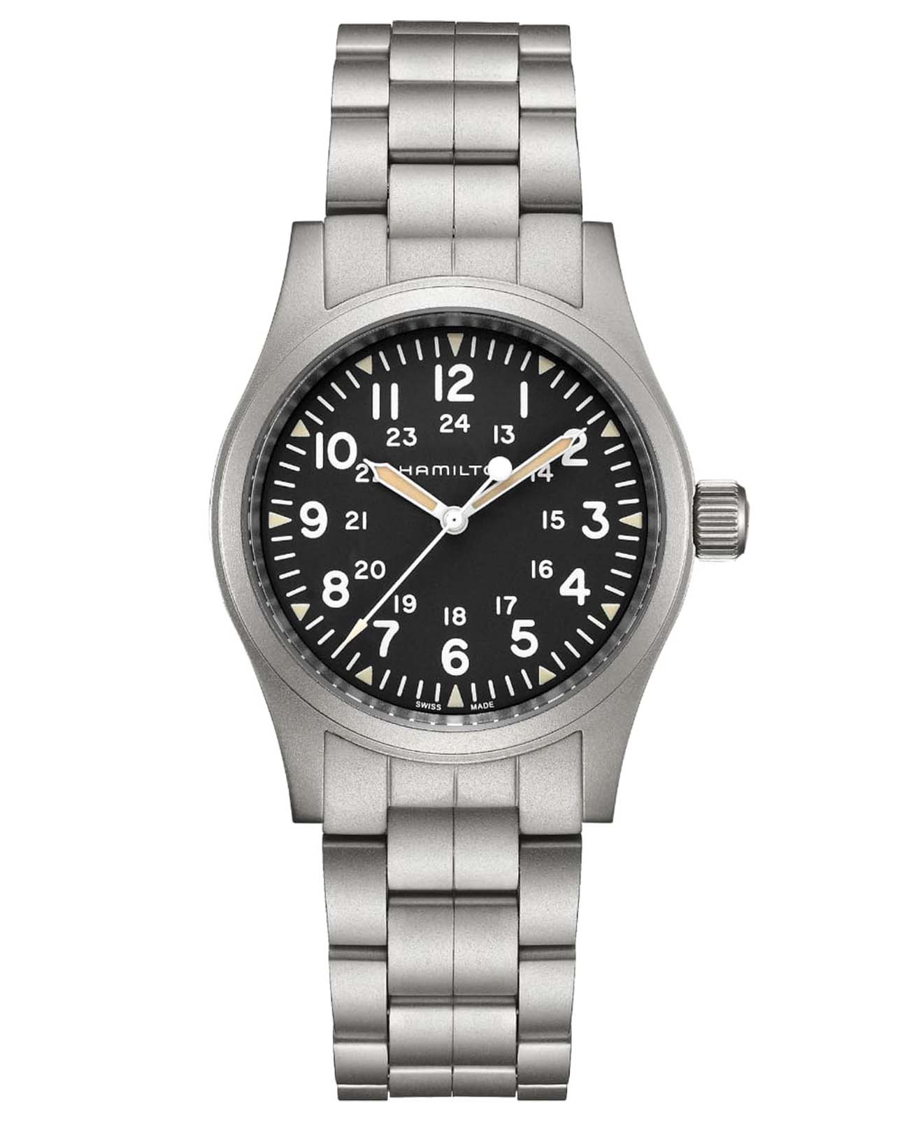 Оригинальные солдатские часы выглядят спортивнее, чем когда-либо, благодаря удобному браслету из нержавеющей стали. Новейший полевой механический стиль цвета хаки, оснащенный эксклюзивным механизмом с ручным заводом H-50, не подведет вас. Прочные и надежные, эти 38-миллиметровые полевые часы готовы к приключениям. Механический механизм (автоматический калибр) с высокой точностью. Сапфировое стеклоСапфировое стеклоПрочный и надёжный материал из кристалла сапфира синтетического происхождения, характеризующийся особой твёрдостью и устойчивостью к царапинам и повреждениям. устойчивое к появлению царапин, обладающее высокой прозрачностью. Стрелки с люминесцентным покрытиемЛюминесцентное покрытиеПозволяет считывать показания времени в темноте. Производители наносят на стрелки, часовые индексы, безель или поверхность циферблата светонакопительный состав, дающий холодное свечение.. Класс водозащиты: 50 метров, позволит защитить корпус от случайных брызг или капель дождя. Корпус часов изготовлен из нержавеющей стали. Браслет с раскладной застёжкойРаскладная застёжкаТакой тип застёжки используется только на браслетах из металла. Она никогда не раскрывается полностью, происходит разделение на 2 и более частей. Раскладывающая застёжка снизит вероятность потери часов к минимуму..