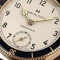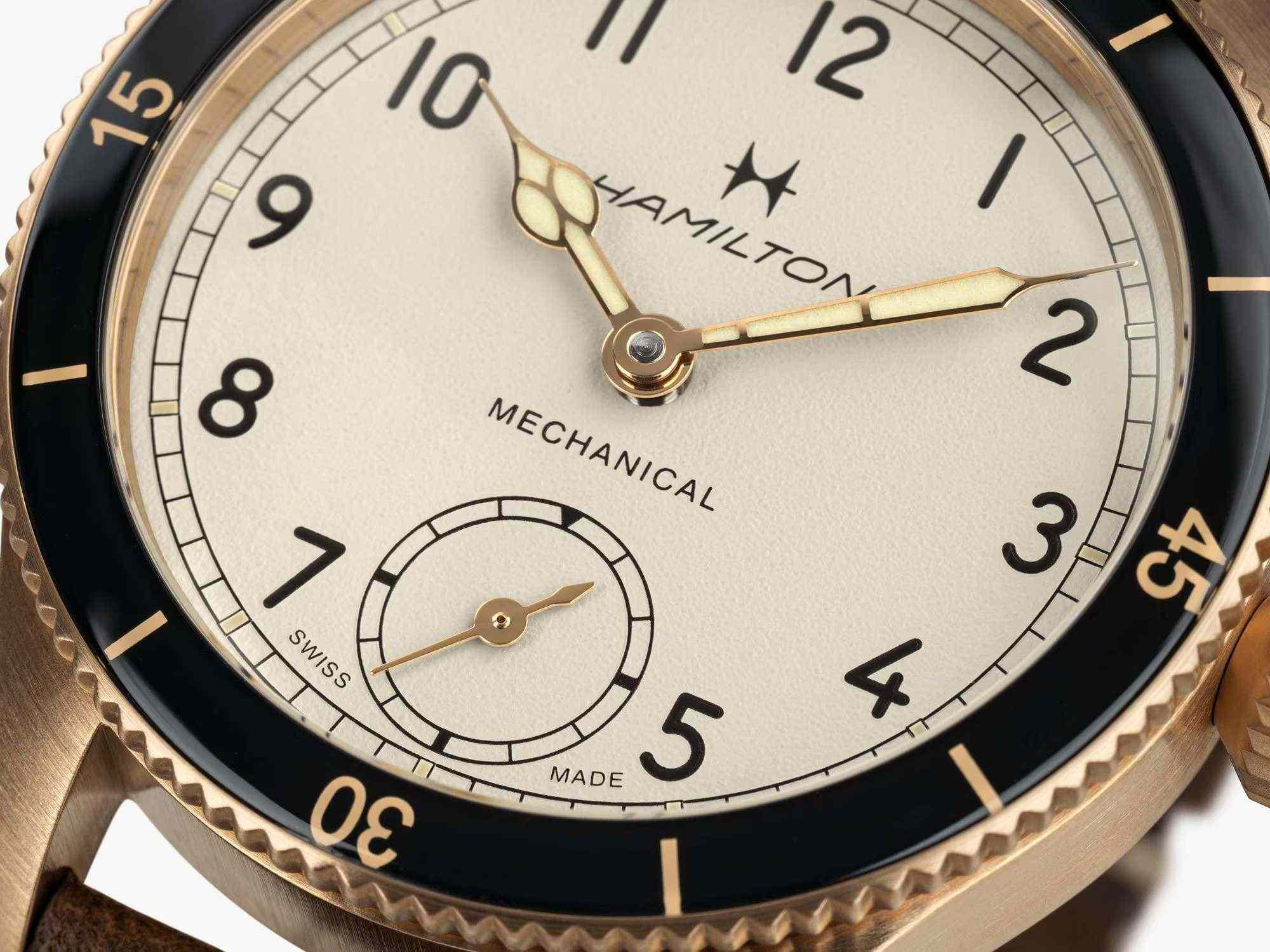Мужские стильные швейцарские часы Hamilton Khaki Aviation Pilot Pioneer Mechanical 43mm H76709510. Корпус из бронзы диаметром 43 мм с изысканным дизайном и увеличенной толщиной 13 мм подчеркивает элегантность модели, поворотный безельБезельВнешний ободок, закрепляющий стекло. В спортивных часах так называется поворотное кольцо с делениями на циферблате, выполняет роль таймера – замеряет отрезки времени на шкале. Неподвижный безель – элемент декора. Однонаправленно вращающийся безель на дайверских часах позволяет фиксировать моменты погружения и выныривания на поверхность. изготовлен из титана, а сапфировое стеклоСапфировое стеклоПрочный и надёжный материал из кристалла сапфира синтетического происхождения, характеризующийся особой твёрдостью и устойчивостью к царапинам и повреждениям. с антибликовым покрытиемАнтибликовое покрытиеСлой оксида металла в 0,13-0,3 микрон, благодаря которому стекло часов не бликует и не отражает свет. Антибликовое покрытие уменьшает отражение света в 10 раз, обеспечивая отличную читаемость показателей циферблата. обеспечивает превосходную читаемость лаконичного циферблата со стрелками с люминесцентным покрытиемЛюминесцентное покрытиеПозволяет считывать показания времени в темноте. Производители наносят на стрелки, часовые индексы, безель или поверхность циферблата светонакопительный состав, дающий холодное свечение. Super-LumiNova®. Механизм с ручным заводом ETA 6498-1, обеспечивающей запас хода 50 часов. Изысканный ремешок выполнен из кожи со стандартной застежкой, гарантирующей комфортное ношение и безопасность. Водонепроницаемость часов достигает 10 атмосфер (100 метров), делающая их подходящими для повседневного использования и активного отдыха. Это сочетание высокой прочности, точности и изысканного дизайна для уверенных в себе мужчин.