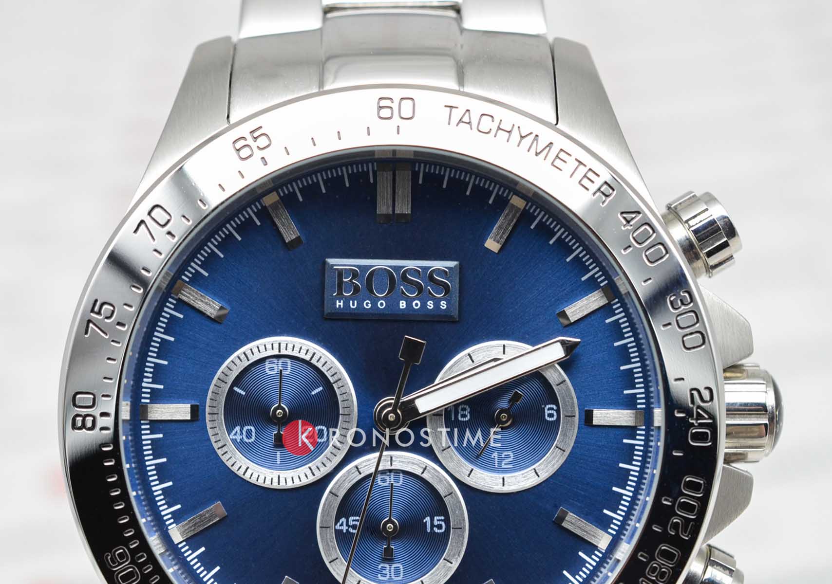 Мужские кварцевые часы Hugo Boss Ikon HB1512963 представляют собой стильный хронографХронографФункция позволяет измерять отрезки времени с особой точностью: часы, минуты, секунды. Верным признаком хронографа является наличие на циферблате 3 дополнительных окошек-счётчиков. с круглым корпусом диаметром 44 мм из нержавеющей стали, дополненным черным циферблатом с серебристыми стрелками и индексами. Модель оснащена высокоточным кварцевым механизмом с функцией хронографаХронографФункция позволяет измерять отрезки времени с особой точностью: часы, минуты, секунды. Верным признаком хронографа является наличие на циферблате 3 дополнительных окошек-счётчиков., включая 60-минутный счетчик и 24-часовой индикатор, а также тахиметрической шкалойТахиметрРазмеченная шкала, располагается на ободке или безеле часов. Тахиметр позволяет рассчитать скорость на определённом участке пути, расстояние измеряется в километрах или милях. на безэлеБезельВнешний ободок, закрепляющий стекло. В спортивных часах так называется поворотное кольцо с делениями на циферблате, выполняет роль таймера – замеряет отрезки времени на шкале. Неподвижный безель – элемент декора. Однонаправленно вращающийся безель на дайверских часах позволяет фиксировать моменты погружения и выныривания на поверхность. для расчетов скорости. Циферблат защищен устойчивым к царапинам минеральным стекломМинеральное стеклоМинеральное стекло представляет собой искусственно выращенный минерал кварца. Такое стекло отличается особой устойчивостью к повреждениям и царапинам. Уступает по некоторым качествам сапфировому стеклу., а водонепроницаемость 5 ATM (50 метров) обеспечивает защиту от брызг и дождя. Глубокий синий циферблат с люминесцентным покрытиемЛюминесцентное покрытиеПозволяет считывать показания времени в темноте. Производители наносят на стрелки, часовые индексы, безель или поверхность циферблата светонакопительный состав, дающий холодное свечение. на стрелках, обеспечивает отличную читаемость в любое время суток. Стальной браслет с раскладной застежкойРаскладная застёжкаТакой тип застёжки используется только на браслетах из металла. Она никогда не раскрывается полностью, происходит разделение на 2 и более частей. Раскладывающая застёжка снизит вероятность потери часов к минимуму. обеспечивает надежную посадку на запястье.