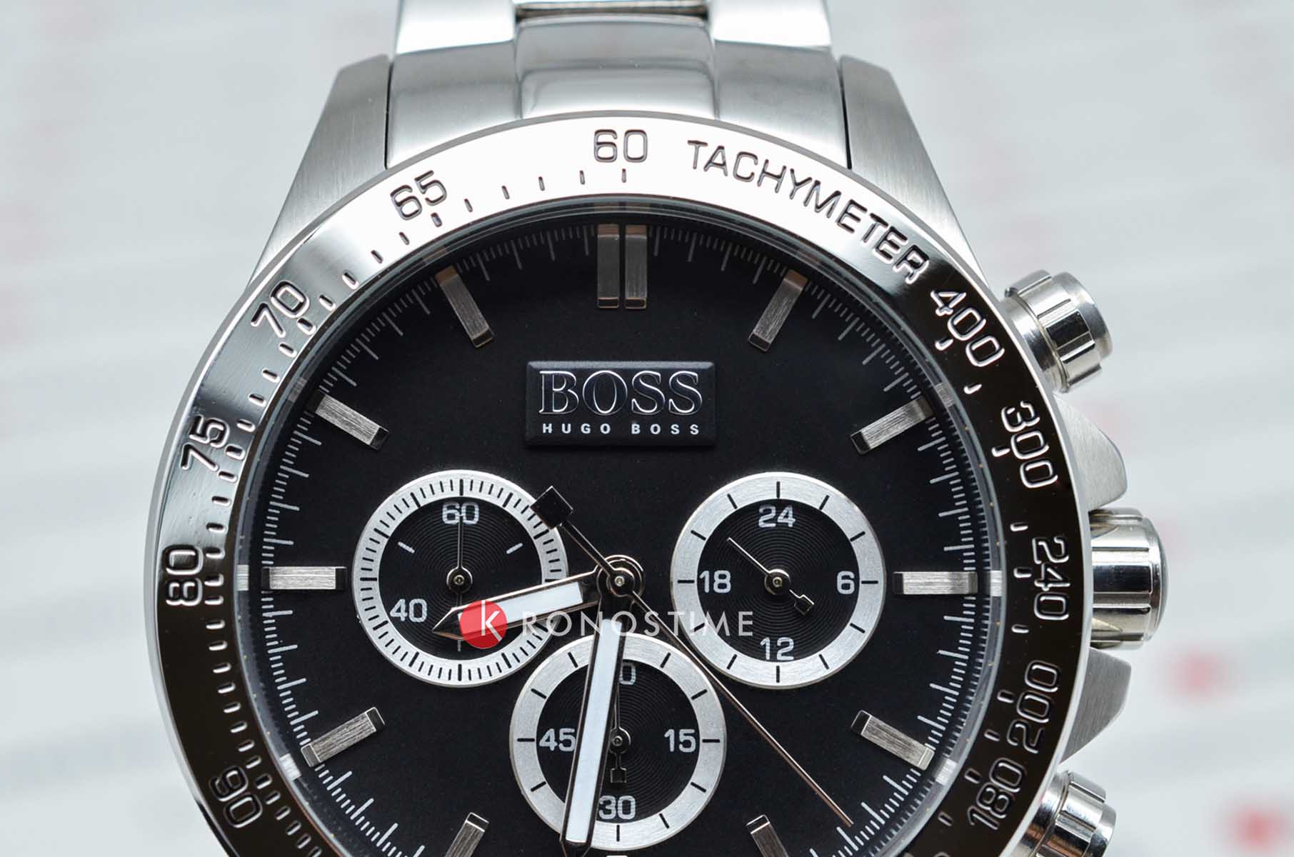 Мужские кварцевые часы Hugo Boss Ikon HB1512965 представляют собой стильный хронографХронографФункция позволяет измерять отрезки времени с особой точностью: часы, минуты, секунды. Верным признаком хронографа является наличие на циферблате 3 дополнительных окошек-счётчиков. с круглым корпусом диаметром 44 мм из нержавеющей стали, дополненным черным циферблатом с серебристыми стрелками и индексами для оптимальной читаемости. Модель оснащена высокоточным кварцевым механизмом с функцией хронографаХронографФункция позволяет измерять отрезки времени с особой точностью: часы, минуты, секунды. Верным признаком хронографа является наличие на циферблате 3 дополнительных окошек-счётчиков., включая 60-минутный счетчик и 24-часовой индикатор, а также тахиметрической шкалой на безелеБезельВнешний ободок, закрепляющий стекло. В спортивных часах так называется поворотное кольцо с делениями на циферблате, выполняет роль таймера – замеряет отрезки времени на шкале. Неподвижный безель – элемент декора. Однонаправленно вращающийся безель на дайверских часах позволяет фиксировать моменты погружения и выныривания на поверхность. для расчетов скорости. Циферблат защищен устойчивым к царапинам минеральным стекломМинеральное стеклоМинеральное стекло представляет собой искусственно выращенный минерал кварца. Такое стекло отличается особой устойчивостью к повреждениям и царапинам. Уступает по некоторым качествам сапфировому стеклу., а водонепроницаемость 5 ATM (50 метров) обеспечивает защиту от брызг и дождя, делая часы практичными для повседневного использования. Стальной браслет с раскладной застежкойРаскладная застёжкаТакой тип застёжки используется только на браслетах из металла. Она никогда не раскрывается полностью, происходит разделение на 2 и более частей. Раскладывающая застёжка снизит вероятность потери часов к минимуму. обеспечивает надежную и комфортную посадку на запястье, подчеркивая спортивно-элегантный стиль модели.