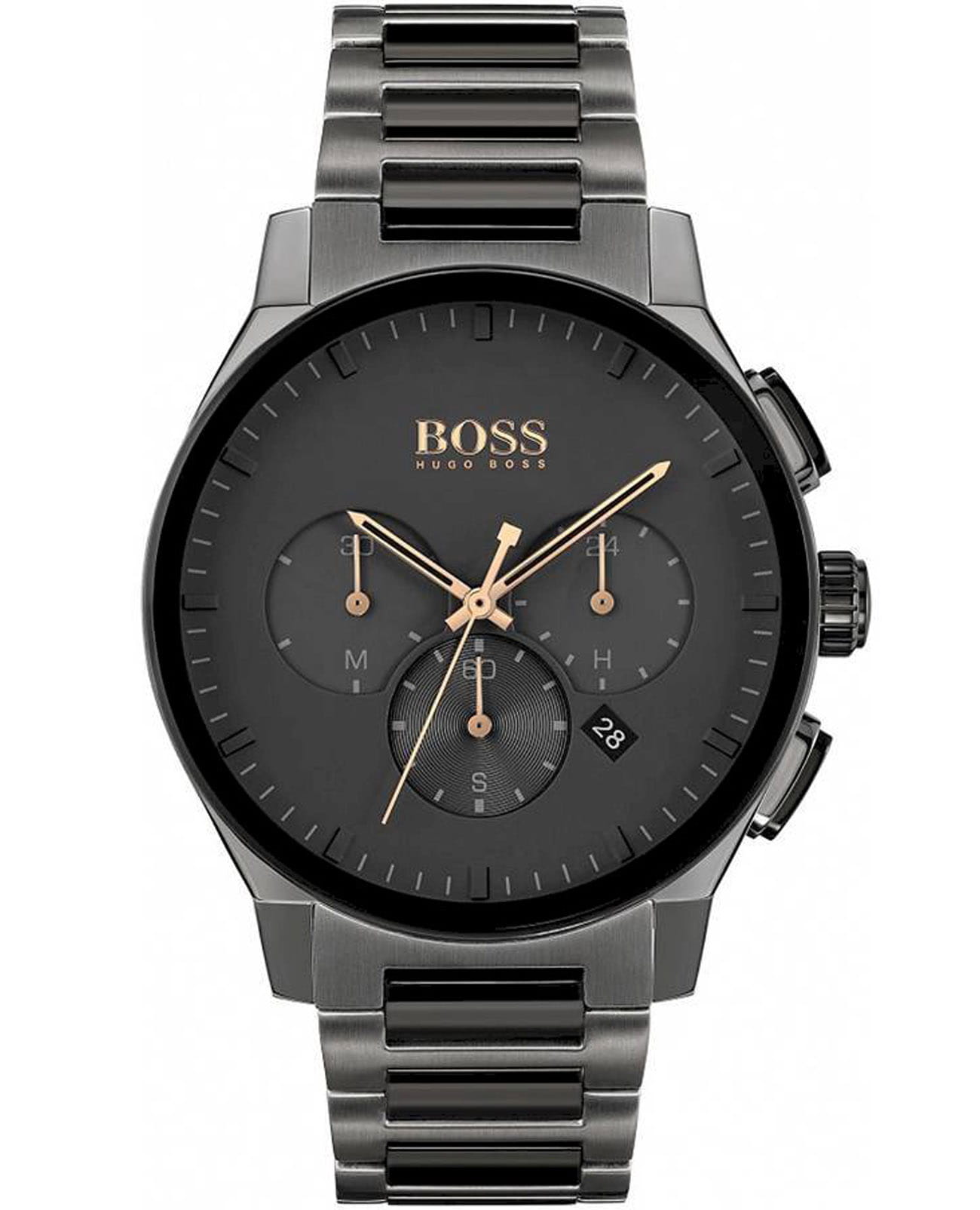 Мужские элегантные часы Hugo Boss Peak HB1513814 представлены в круглом 44-мм корпусе из нержавеющей стали. Эта изысканная модель оснащена кварцевым механизмом. Часы представлены функциями хронографаХронографФункция позволяет измерять отрезки времени с особой точностью: часы, минуты, секунды. Верным признаком хронографа является наличие на циферблате 3 дополнительных окошек-счётчиков. и секундомераСекундомерСекундоме́р — прибор, способный измерять интервалы времени с точностью до долей секунды.. Черный циферблат защищен устойчивым к царапинам минеральным стекломМинеральное стеклоМинеральное стекло представляет собой искусственно выращенный минерал кварца. Такое стекло отличается особой устойчивостью к повреждениям и царапинам. Уступает по некоторым качествам сапфировому стеклу.. Браслет и корпус из стали с PVD-покрытиемPVDУльтратонкое покрытие наносится в технике вакуумного напыления, сочетает в себе нитрид титана особой прочности со слоем золота или оксида хрома. Несёт в себе декоративную или защитную функцию. черного цвета. Черный браслет дополнен удобной и надежной раскладной застёжкойРаскладная застёжкаТакой тип застёжки используется только на браслетах из металла. Она никогда не раскрывается полностью, происходит разделение на 2 и более частей. Раскладывающая застёжка снизит вероятность потери часов к минимуму.. Водонепроницаемость 30 метров (3 ATM), что позволяет использовать часы в повседневных условиях, защищая от случайных брызг и капель дождя. Индикация даты находится между 4 и 5 часами.Точность хода составляет ±15 секунд в месяц, что соответствует стандартам кварцевых механизмов. Дизайн модели сочетает спортивную функциональность с элегантным стилем.