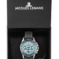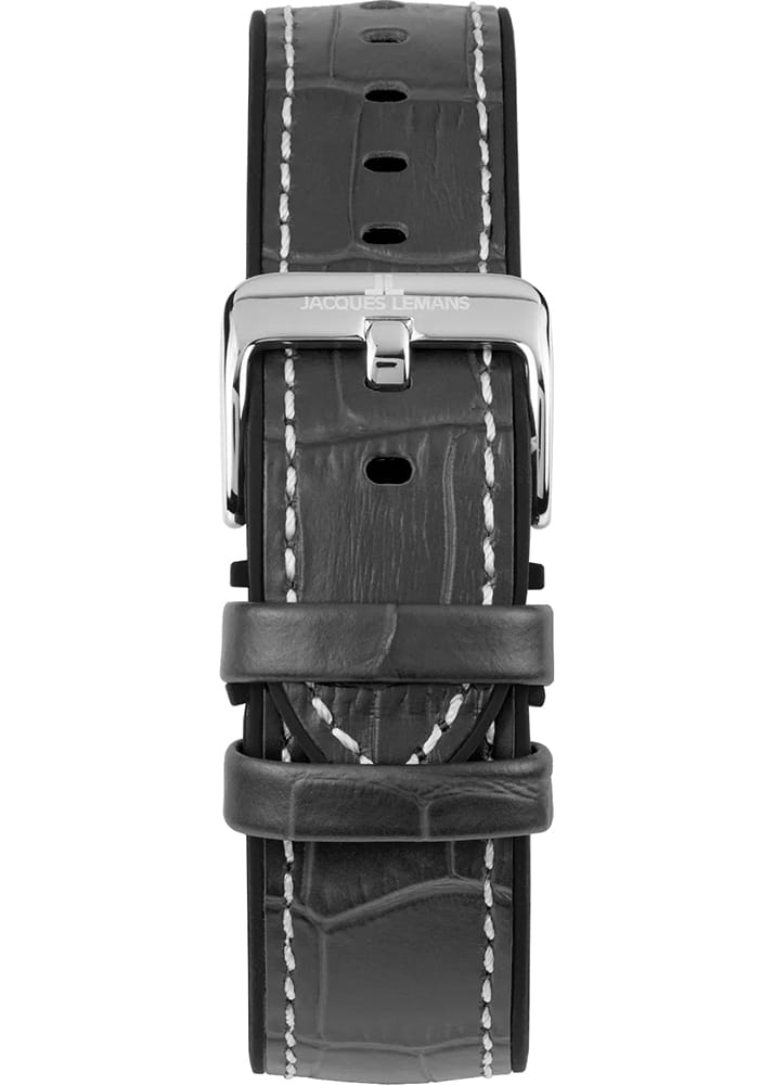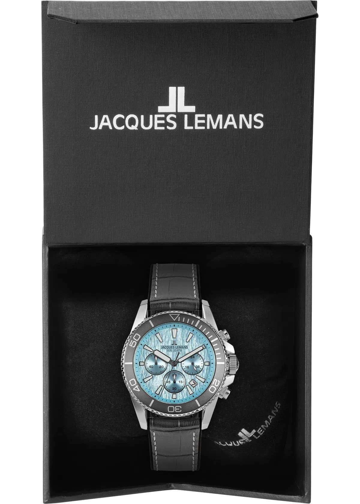 Мужские кварцевые часы-хронографХронографФункция позволяет измерять отрезки времени с особой точностью: часы, минуты, секунды. Верным признаком хронографа является наличие на циферблате 3 дополнительных окошек-счётчиков. с секундомеромСекундомерСекундоме́р — прибор, способный измерять интервалы времени с точностью до долей секунды. Jacques Lemans 1-2206E – лаконичная красота и изысканная элегантность. Оригинальная модель с классическим оформлением станет превосходным завершением образа, наделив его индивидуальным характером. Корпус выполнен из нержавеющей стали серебристого цвета, диаметром 44 мм, что обеспечивает долговечность и утончённый внешний вид. Минеральное стеклоМинеральное стеклоМинеральное стекло представляет собой искусственно выращенный минерал кварца. Такое стекло отличается особой устойчивостью к повреждениям и царапинам. Уступает по некоторым качествам сапфировому стеклу. повышенной прочности Crystex защищает циферблат от царапин. Поворотный безельБезельВнешний ободок, закрепляющий стекло. В спортивных часах так называется поворотное кольцо с делениями на циферблате, выполняет роль таймера – замеряет отрезки времени на шкале. Неподвижный безель – элемент декора. Однонаправленно вращающийся безель на дайверских часах позволяет фиксировать моменты погружения и выныривания на поверхность. с PVD-покрытиемPVDУльтратонкое покрытие наносится в технике вакуумного напыления, сочетает в себе нитрид титана особой прочности со слоем золота или оксида хрома. Несёт в себе декоративную или защитную функцию.. Ремешок состоит из двух частей: внутренняя сделана из силикона, внешняя — из натуральной кожи. Классическая застежка с логотипом бренда. Водозащита 200 метров позволит плавать, нырять и заниматься другими водными видами спорта. Стрелки и метки с люминесцентным покрытиемЛюминесцентное покрытиеПозволяет считывать показания времени в темноте. Производители наносят на стрелки, часовые индексы, безель или поверхность циферблата светонакопительный состав, дающий холодное свечение. позволяющие легко определять время даже в темноте. 12-ти и 24-х часовой формат времени. Окошко даты находится в положении между 4 и 5 часами. Рифленая заводная головка с защитой. Это аксессуар для мужчины, который ценит классический стиль и функциональность.