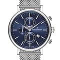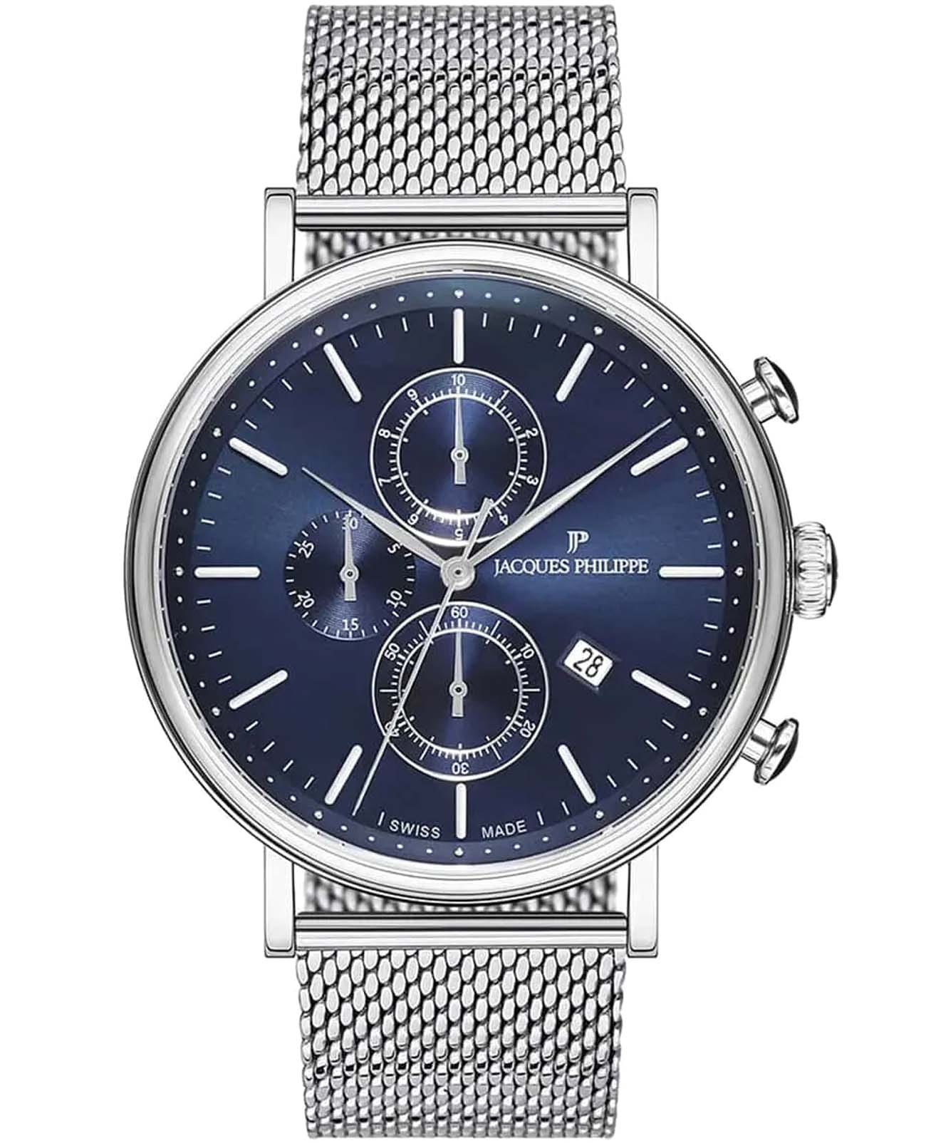Швейцарские мужские часы-хронографХронографФункция позволяет измерять отрезки времени с особой точностью: часы, минуты, секунды. Верным признаком хронографа является наличие на циферблате 3 дополнительных окошек-счётчиков. Jacques Philippe Aviator JPQGC021236N кварцевый механизм с высокой точностью. Прочное сапфировое стеклоСапфировое стеклоПрочный и надёжный материал из кристалла сапфира синтетического происхождения, характеризующийся особой твёрдостью и устойчивостью к царапинам и повреждениям. устойчивое к появлению царапин, обладающее высокой прозрачностью. Циферблат синего цвета украшен классическими стрелками и метками. Элегантный корпус изготовлен из нержавеющей стали, диаметром 44 мм, что делает их устойчивыми к внешним воздействиям и придает благородный вид. На циферблате три дополнительных индикатора. Стальной браслет миланского плетения на застёжке-бабочке с кнопкамиЗастёжка "бабочка"Такой вид застёжки дополняется предохранителями, помогающими избежать случайного раскрытия браслета. Обладают изящным исполнением. обеспечивает комфортное и безопасное ношение. Окошко даты находится в положении 4 часов. Класс водозащиты: 50 метров позволит защитить корпус от случайных брызг или капель дождя. Эти часы станут идеальным выбором для мужчин, ценящих стиль, качество и функциональность.
