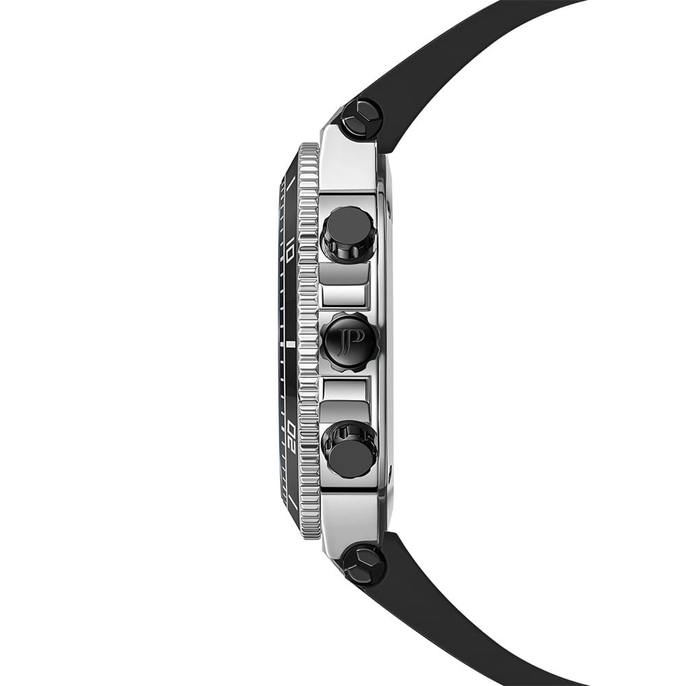 Jacques Philippe JPQGC447411SB — стильные швейцарские часы с функцией хронографаХронографФункция позволяет измерять отрезки времени с особой точностью: часы, минуты, секунды. Верным признаком хронографа является наличие на циферблате 3 дополнительных окошек-счётчиков. и секундомераСекундомерСекундоме́р — прибор, способный измерять интервалы времени с точностью до долей секунды., которые сочетают в себе элегантность и современный функционал. Круглый корпус диаметром 43 мм выполнен из серебристого металла, толщина корпуса составляет 12 мм, а на вращающийся безельБезельВнешний ободок, закрепляющий стекло. В спортивных часах так называется поворотное кольцо с делениями на циферблате, выполняет роль таймера – замеряет отрезки времени на шкале. Неподвижный безель – элемент декора. Однонаправленно вращающийся безель на дайверских часах позволяет фиксировать моменты погружения и выныривания на поверхность. нанесено черное IP-покрытиеIP-покрытиеМетод ионного напыления. Демонстрирует повышенную устойчивость к истиранию, окислению и химическим веществам. Под воздействием высокого давления и температуры около 1500°C молекулы металла надёжно соединяются с частицами корпуса часов., что придает модели выразительный внешний вид и надежную защиту от внешних воздействий. Часы оснащены кварцевым механизмом Ronda 5030.D также обладают функцией отображения даты, что делает их удобными для ежедневного использования. Черный циферблат гармонично сочетается с черным браслетом шириной 23 мм, который фиксируется классической застежкой. Сапфировое стеклоСапфировое стеклоПрочный и надёжный материал из кристалла сапфира синтетического происхождения, характеризующийся особой твёрдостью и устойчивостью к царапинам и повреждениям. защищает часы от царапин, а водозащита 10 АТМ позволяет не снимать их во время плавания и занятий спортом. Стрелки и метки с люминесцентным покрытиемЛюминесцентное покрытиеПозволяет считывать показания времени в темноте. Производители наносят на стрелки, часовые индексы, безель или поверхность циферблата светонакопительный состав, дающий холодное свечение. обеспечивают отличную читаемость в любое время суток.