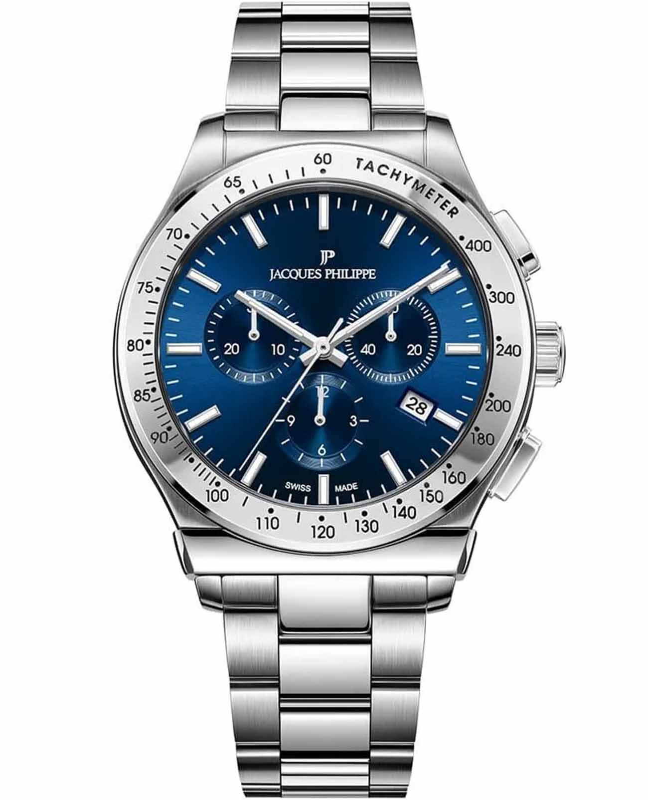Jacques Philippe JPQGC701336 — швейцарские наручные часы, которые станут идеальным дополнением к образу современного мужчины, ценящего стиль и качество, это стильные швейцарские часы с функцией хронографаХронографФункция позволяет измерять отрезки времени с особой точностью: часы, минуты, секунды. Верным признаком хронографа является наличие на циферблате 3 дополнительных окошек-счётчиков. и секундомераСекундомерСекундоме́р — прибор, способный измерять интервалы времени с точностью до долей секунды.. Корпус и браслет выполнены из высокопрочной нержавеющей стали 316L, что подчеркивает статус владельца и гарантирует долговечность аксессуара. Классический дизайн с синим циферблатом гармонично сочетается с современными деталями: тахиметрическаяТахиметрРазмеченная шкала, располагается на ободке или безеле часов. Тахиметр позволяет рассчитать скорость на определённом участке пути, расстояние измеряется в километрах или милях. шкала на безелеБезельВнешний ободок, закрепляющий стекло. В спортивных часах так называется поворотное кольцо с делениями на циферблате, выполняет роль таймера – замеряет отрезки времени на шкале. Неподвижный безель – элемент декора. Однонаправленно вращающийся безель на дайверских часах позволяет фиксировать моменты погружения и выныривания на поверхность. добавляет функциональности, а окошко даты, расположенное на отметке «4 часа», обеспечивает дополнительное удобство. Сапфировое стеклоСапфировое стеклоПрочный и надёжный материал из кристалла сапфира синтетического происхождения, характеризующийся особой твёрдостью и устойчивостью к царапинам и повреждениям. надежно защищает часы от царапин и повреждений, сохраняя их безупречный внешний вид. Кварцевый механизм обеспечивает точный ход и не требует частого обслуживания. Водозащита до 10 атмосфер (100 метров) позволяет не снимать часы во время плавания. Стрелки имеют люминесцентное покрытиеЛюминесцентное покрытиеПозволяет считывать показания времени в темноте. Производители наносят на стрелки, часовые индексы, безель или поверхность циферблата светонакопительный состав, дающий холодное свечение. для удобства чтения времени в темноте. Стальной браслет шириной 20 мм оснащен застежкой «бабочка»Застёжка "бабочка"Такой вид застёжки дополняется предохранителями, помогающими избежать случайного раскрытия браслета. Обладают изящным исполнением. для комфортного ношения в течение всего дня.
