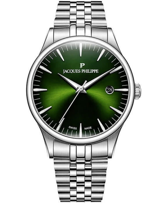 Jacques Philippe JPQGS6613X6 — стильные мужские часы в классическом формате с акцентом на надёжность и элегантность. Корпус круглой формы диаметром 40 мм из нержавеющей стали отличается утонченным силуэтом при толщине примерно 12 мм, обеспечивая комфорт при длительном ношении . Циферблат оформлен лаконично: тонкие стрелки и минималистичные часовые метки с люминесцентным покрытиемЛюминесцентное покрытиеПозволяет считывать показания времени в темноте. Производители наносят на стрелки, часовые индексы, безель или поверхность циферблата светонакопительный состав, дающий холодное свечение. подчёркивают строгий характер модели. Встроенная функция отображения даты придаёт часам практичность без лишнего визуального нагромождения. Поверхность защищает сапфировое стеклоСапфировое стеклоПрочный и надёжный материал из кристалла сапфира синтетического происхождения, характеризующийся особой твёрдостью и устойчивостью к царапинам и повреждениям. — устойчивое к царапинам и бликам. Внутри используется точный швейцарский кварцевый механизм, не требующий подзавода и сохраняющий стабильную работу без сложного обслуживания. Модель оснащена металлическим браслетом из нержавеющей стали в оттенке металлик‑серый на застёжке-бабочке с кнопкамиЗастёжка "бабочка"Такой вид застёжки дополняется предохранителями, помогающими избежать случайного раскрытия браслета. Обладают изящным исполнением. , ширина звеньев около 22 мм, что обеспечивает надёжную посадку и солидный внешний вид . Водозащита составляет до 5 ATM, — часы без проблем выдерживают случайный контакт с водой в повседневной эксплуатации . Jacques Philippe — гармоничное сочетание классического стиля, точного швейцарского кварца и практичности в одном надёжном аксессуаре.