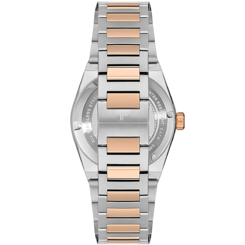 Часы Jacques Philippe JPQLS527388S из коллекции Aurora — элегантные мужские часы, сочетающие швейцарское качество и современный дизайн. Корпус диаметром 34 мм выполнен из нержавеющей стали, а белый циферблат защищён сапфировым стекломСапфировое стеклоПрочный и надёжный материал из кристалла сапфира синтетического происхождения, характеризующийся особой твёрдостью и устойчивостью к царапинам и повреждениям.. БезельБезельВнешний ободок, закрепляющий стекло. В спортивных часах так называется поворотное кольцо с делениями на циферблате, выполняет роль таймера – замеряет отрезки времени на шкале. Неподвижный безель – элемент декора. Однонаправленно вращающийся безель на дайверских часах позволяет фиксировать моменты погружения и выныривания на поверхность. с PVD-покрытиемPVDУльтратонкое покрытие наносится в технике вакуумного напыления, сочетает в себе нитрид титана особой прочности со слоем золота или оксида хрома. Несёт в себе декоративную или защитную функцию.. Циферблат инкрустирован кристаллами.