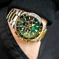 Мужские швейцарские часы-хронографХронографФункция позволяет измерять отрезки времени с особой точностью: часы, минуты, секунды. Верным признаком хронографа является наличие на циферблате 3 дополнительных окошек-счётчиков. Jaguar Executive Diver Chrono J862/3. Кварцевый швейцарский калибр Ronda 6003D. Сапфировое стеклоСапфировое стеклоПрочный и надёжный материал из кристалла сапфира синтетического происхождения, характеризующийся особой твёрдостью и устойчивостью к царапинам и повреждениям. устойчивое к мелким механическим повреждениям. Корпус часов изготовлен из нержавеющей стали. Стрелки и метки с люминесцентным покрытиемЛюминесцентное покрытиеПозволяет считывать показания времени в темноте. Производители наносят на стрелки, часовые индексы, безель или поверхность циферблата светонакопительный состав, дающий холодное свечение.. Окошко даты находится в положении между «4» и «5 часами». Класс водозащиты: 200 метров, позволит плавать, нырять и заниматься другими водными видами спорта. Стальной браслет с частичным PVD-покрытиемPVDУльтратонкое покрытие наносится в технике вакуумного напыления, сочетает в себе нитрид титана особой прочности со слоем золота или оксида хрома. Несёт в себе декоративную или защитную функцию. на раскладной застёжкеРаскладная застёжкаТакой тип застёжки используется только на браслетах из металла. Она никогда не раскрывается полностью, происходит разделение на 2 и более частей. Раскладывающая застёжка снизит вероятность потери часов к минимуму.. БезельБезельВнешний ободок, закрепляющий стекло. В спортивных часах так называется поворотное кольцо с делениями на циферблате, выполняет роль таймера – замеряет отрезки времени на шкале. Неподвижный безель – элемент декора. Однонаправленно вращающийся безель на дайверских часах позволяет фиксировать моменты погружения и выныривания на поверхность. с PVD-покрытиемPVDУльтратонкое покрытие наносится в технике вакуумного напыления, сочетает в себе нитрид титана особой прочности со слоем золота или оксида хрома. Несёт в себе декоративную или защитную функцию..