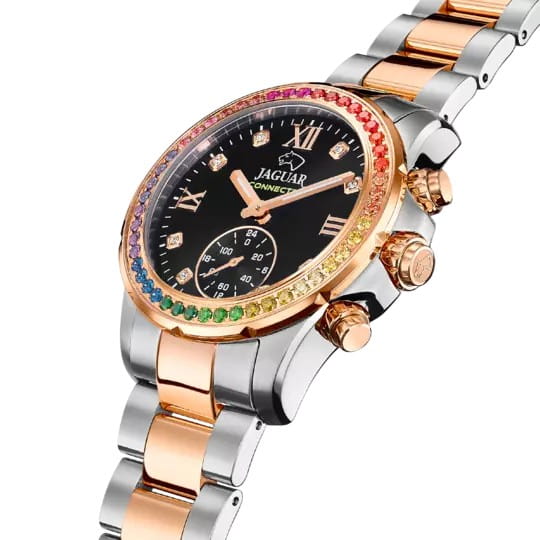 Женские швейцарские часы Jaguar Connected Lady J981/5. Сапфировое стеклоСапфировое стеклоПрочный и надёжный материал из кристалла сапфира синтетического происхождения, характеризующийся особой твёрдостью и устойчивостью к царапинам и повреждениям. устойчивое к мелким механическим повреждениям. Корпус часов изготовлен из нержавеющей стали. Стрелки и метки с люминесцентным покрытиемЛюминесцентное покрытиеПозволяет считывать показания времени в темноте. Производители наносят на стрелки, часовые индексы, безель или поверхность циферблата светонакопительный состав, дающий холодное свечение.. Класс водозащиты: 50 метров, позволит защитить корпус от случайных брызг или капель дождя. БезельБезельВнешний ободок, закрепляющий стекло. В спортивных часах так называется поворотное кольцо с делениями на циферблате, выполняет роль таймера – замеряет отрезки времени на шкале. Неподвижный безель – элемент декора. Однонаправленно вращающийся безель на дайверских часах позволяет фиксировать моменты погружения и выныривания на поверхность. с PVD-покрытиемPVDУльтратонкое покрытие наносится в технике вакуумного напыления, сочетает в себе нитрид титана особой прочности со слоем золота или оксида хрома. Несёт в себе декоративную или защитную функцию. и циферблат инкрустированы цирконием. Стальной браслет с частичным  PVD-покрытиемPVDУльтратонкое покрытие наносится в технике вакуумного напыления, сочетает в себе нитрид титана особой прочности со слоем золота или оксида хрома. Несёт в себе декоративную или защитную функцию. на раскладной застёжкеРаскладная застёжкаТакой тип застёжки используется только на браслетах из металла. Она никогда не раскрывается полностью, происходит разделение на 2 и более частей. Раскладывающая застёжка снизит вероятность потери часов к минимуму.. За точный ход работы часов, из коллекции Connected, отвечает кварцевый гибридный механизм швейцарского производства со Смарт-Модулем. Данный тип механизма обеспечивает возможность подключить часы к телефону через Bluetooth и управлять большим рядом дополнительных функций на выбор с помошью приложения Jaguar. Дополнительные функции: отображение даты и дня недели, секундомер, таймер, GMT, шагомер, поиск телефона, включение/выключение звука телефона при входящих вызовах, переключение музыки, вибро-уведомления.