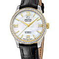 Женские швейцарские часы Jaguar Automatic Woman J998/B, механизм — автоподзавод. В часах с автоподзаводом заводная головка практически не используется, что исключает истирание ее материала и материала корпуса. Сапфировое стеклоСапфировое стеклоПрочный и надёжный материал из кристалла сапфира синтетического происхождения, характеризующийся особой твёрдостью и устойчивостью к царапинам и повреждениям. устойчивое к мелким механическим повреждениям. Корпус и браслет часов изготовлены из нержавеющей стали. Окошко даты находится в положении 6 часов. Класс водозащиты: 50 метров, позволит защитить корпус от случайных брызг или капель дождя. Кожаный ремешок на застёжке-бабочке с кнопкамиЗастёжка "бабочка"Такой вид застёжки дополняется предохранителями, помогающими избежать случайного раскрытия браслета. Обладают изящным исполнением. . БезельБезельВнешний ободок, закрепляющий стекло. В спортивных часах так называется поворотное кольцо с делениями на циферблате, выполняет роль таймера – замеряет отрезки времени на шкале. Неподвижный безель – элемент декора. Однонаправленно вращающийся безель на дайверских часах позволяет фиксировать моменты погружения и выныривания на поверхность. с PVD-покрытиемPVDУльтратонкое покрытие наносится в технике вакуумного напыления, сочетает в себе нитрид титана особой прочности со слоем золота или оксида хрома. Несёт в себе декоративную или защитную функцию. инкрустирован цирконием.