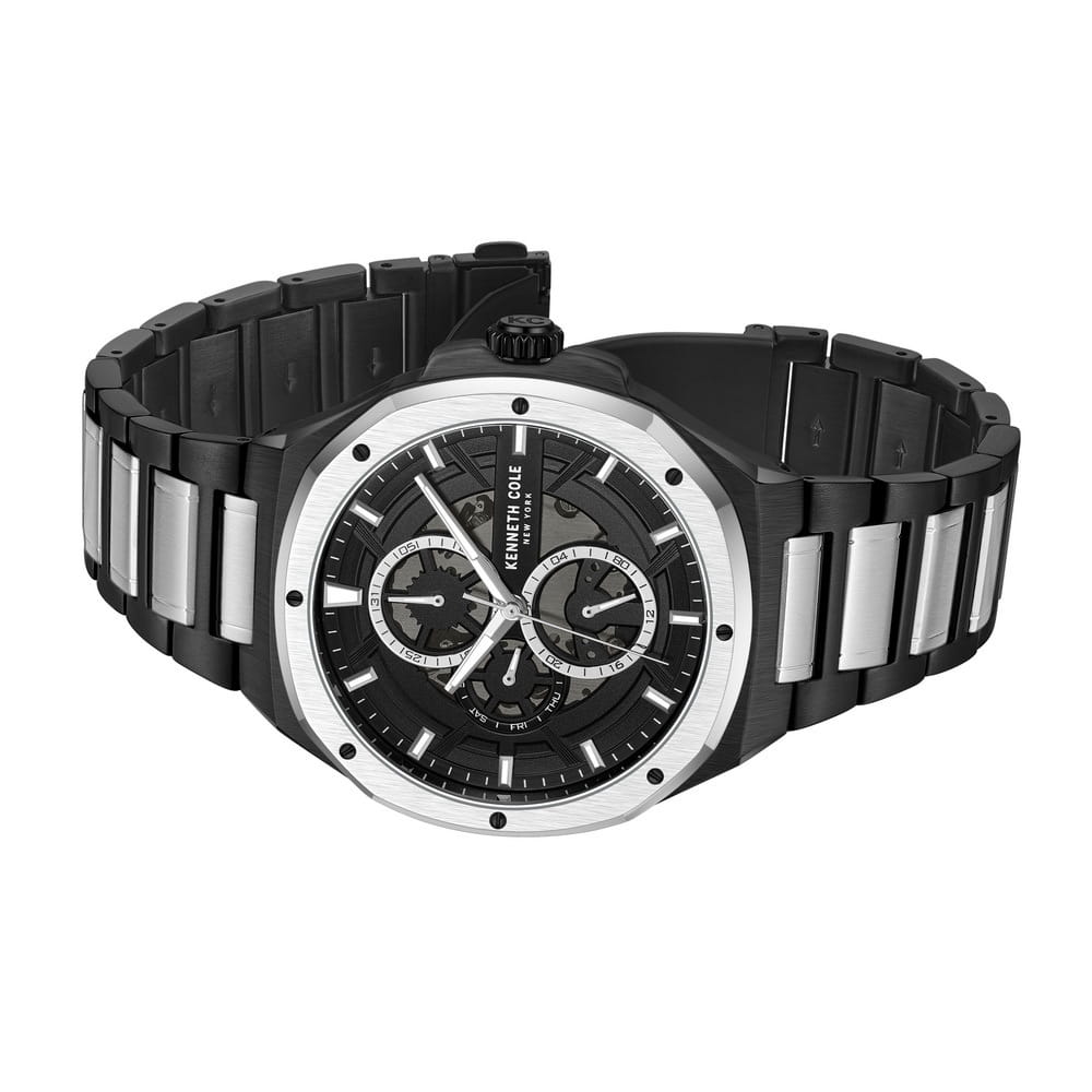 Мужские кварцевые часы Kenneth Cole KCWGK0047203 из коллекции Dress Sport — это стильный и функциональный аксессуар с современным дизайном. Корпус размером 43 мм выполнен из нержавеющей стали 316L с IP-покрытиемIP-покрытиеМетод ионного напыления. Демонстрирует повышенную устойчивость к истиранию, окислению и химическим веществам. Под воздействием высокого давления и температуры около 1500°C молекулы металла надёжно соединяются с частицами корпуса часов.. Циферблат чёрного цвета оформлен метками в виде штрихов и дополнен функцией индикацией даты и 12/24-часовым форматом времени. Стрелки и метки оснащены люминесцентным покрытиемЛюминесцентное покрытиеПозволяет считывать показания времени в темноте. Производители наносят на стрелки, часовые индексы, безель или поверхность циферблата светонакопительный состав, дающий холодное свечение., обеспечивающим хорошую читаемость в темноте. Циферблат защищён минеральным стекломМинеральное стеклоМинеральное стекло представляет собой искусственно выращенный минерал кварца. Такое стекло отличается особой устойчивостью к повреждениям и царапинам. Уступает по некоторым качествам сапфировому стеклу.. Часы оснащены Браслетом из нержавеющей стали с IP-покрытиемIP-покрытиеМетод ионного напыления. Демонстрирует повышенную устойчивость к истиранию, окислению и химическим веществам. Под воздействием высокого давления и температуры около 1500°C молекулы металла надёжно соединяются с частицами корпуса часов. на раскладной застёжкеРаскладная застёжкаТакой тип застёжки используется только на браслетах из металла. Она никогда не раскрывается полностью, происходит разделение на 2 и более частей. Раскладывающая застёжка снизит вероятность потери часов к минимуму.. Водонепроницаемость 50 м позволяет использовать часы для повседневного ношения. Надёжный выбор для тех, кто ценит современный стиль и практичность.
