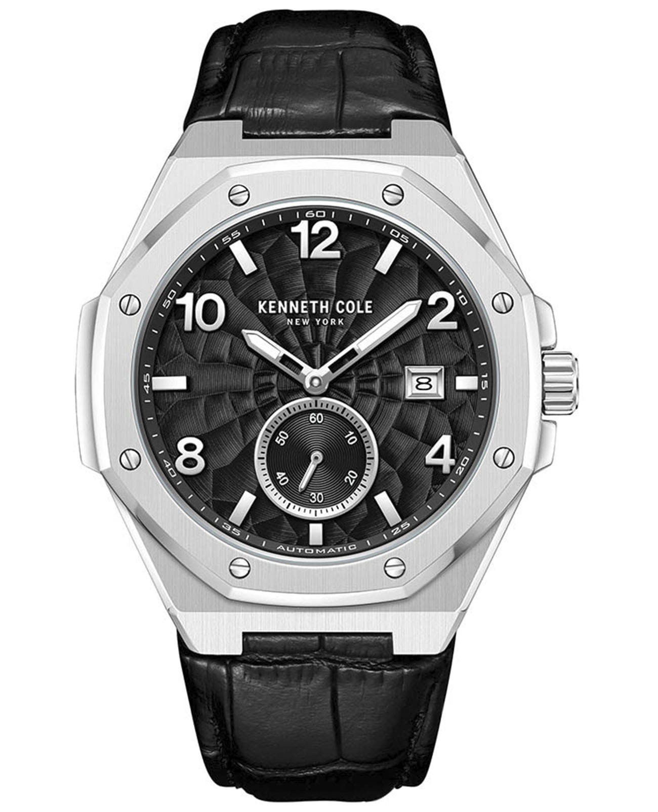 Мужские механические часы с автоподзаводом Kenneth Cole KCWGX0059001 — это стильный и современный аксессуар с выразительным дизайном. Корпус размером 42 мм выполнен из нержавеющей стали. Циферблат чёрного цвета оснащён люминесцентным покрытиемЛюминесцентное покрытиеПозволяет считывать показания времени в темноте. Производители наносят на стрелки, часовые индексы, безель или поверхность циферблата светонакопительный состав, дающий холодное свечение. и оформлен метками в виде арабских цифр и штрихов, а секундная стрелка вынесена на отдельный малый циферблат. Окошко даты расположено в положении 3 часов. Циферблат защищён минеральным стекломМинеральное стеклоМинеральное стекло представляет собой искусственно выращенный минерал кварца. Такое стекло отличается особой устойчивостью к повреждениям и царапинам. Уступает по некоторым качествам сапфировому стеклу.. Часы оснащены ремешком из натуральной кожи чёрного цвета с классической пряжкой. Водонепроницаемость 50 м позволяет использовать часы для плавания и повседневного ношения. Хороший выбор на каждый день.