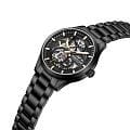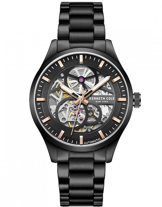 Kenneth Cole KCWGY0080703 — мужская автоматическая модель с эффектным современным дизайном и открытым скелетонизированным циферблатом. Корпус выполнен из нержавеющей стали с PVD-покрытиемPVDУльтратонкое покрытие наносится в технике вакуумного напыления, сочетает в себе нитрид титана особой прочности со слоем золота или оксида хрома. Несёт в себе декоративную или защитную функцию. и дополнен металлическим браслетом, который обеспечивает комфортное прилегание на раскладной застёжкеРаскладная застёжкаТакой тип застёжки используется только на браслетах из металла. Она никогда не раскрывается полностью, происходит разделение на 2 и более частей. Раскладывающая застёжка снизит вероятность потери часов к минимуму. для удобной фиксации. Конструкция циферблата открывает вид на работу автоматического механизма, позволяя наблюдать за его движением. Cтрелки покрыты люминесцентным покрытиемЛюминесцентное покрытиеПозволяет считывать показания времени в темноте. Производители наносят на стрелки, часовые индексы, безель или поверхность циферблата светонакопительный состав, дающий холодное свечение. для читаемости в условиях недостаточного освещения. Защитную функцию выполняет минеральное стеклоМинеральное стеклоМинеральное стекло представляет собой искусственно выращенный минерал кварца. Такое стекло отличается особой устойчивостью к повреждениям и царапинам. Уступает по некоторым качествам сапфировому стеклу., устойчивое к повседневным повреждениям. Водозащита 3 ATM защищает модель от случайных брызг и дождя.