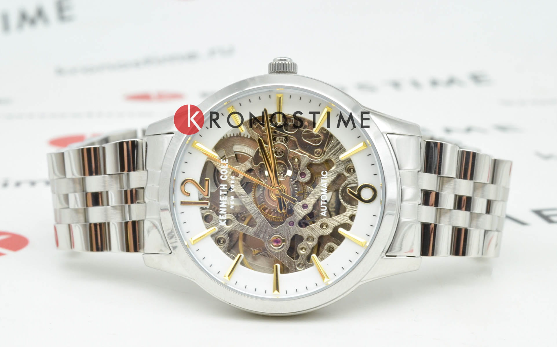 Женские механические часы с автоподзаводом Kenneth Cole KCWLL0047401 — это элегантный аксессуар, сочетающий женственность и современный дизайн. Корпус диаметром 36 мм выполнен из нержавеющей стали. Циферблат белого цвета частично скелетонизирован, что позволяет наблюдать за работой механизма, добавляя модели инженерной изысканности. Циферблат защищён минеральным стекломМинеральное стеклоМинеральное стекло представляет собой искусственно выращенный минерал кварца. Такое стекло отличается особой устойчивостью к повреждениям и царапинам. Уступает по некоторым качествам сапфировому стеклу. и оформлен метками в виде арабских цифр и штрихов. Часы оснащены стальным браслетом с раскладной застёжкойРаскладная застёжкаТакой тип застёжки используется только на браслетах из металла. Она никогда не раскрывается полностью, происходит разделение на 2 и более частей. Раскладывающая застёжка снизит вероятность потери часов к минимуму.. Водонепроницаемость 30 м позволяет использовать часы в повседневных условиях, защищая от случайных брызг и капель дождя. Сочетание лаконичного стиля и надёжного механизма делает эти часы универсальным выбором для повседневного и делового образа.