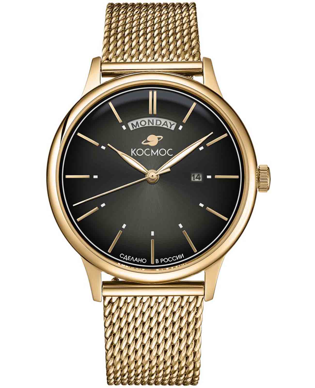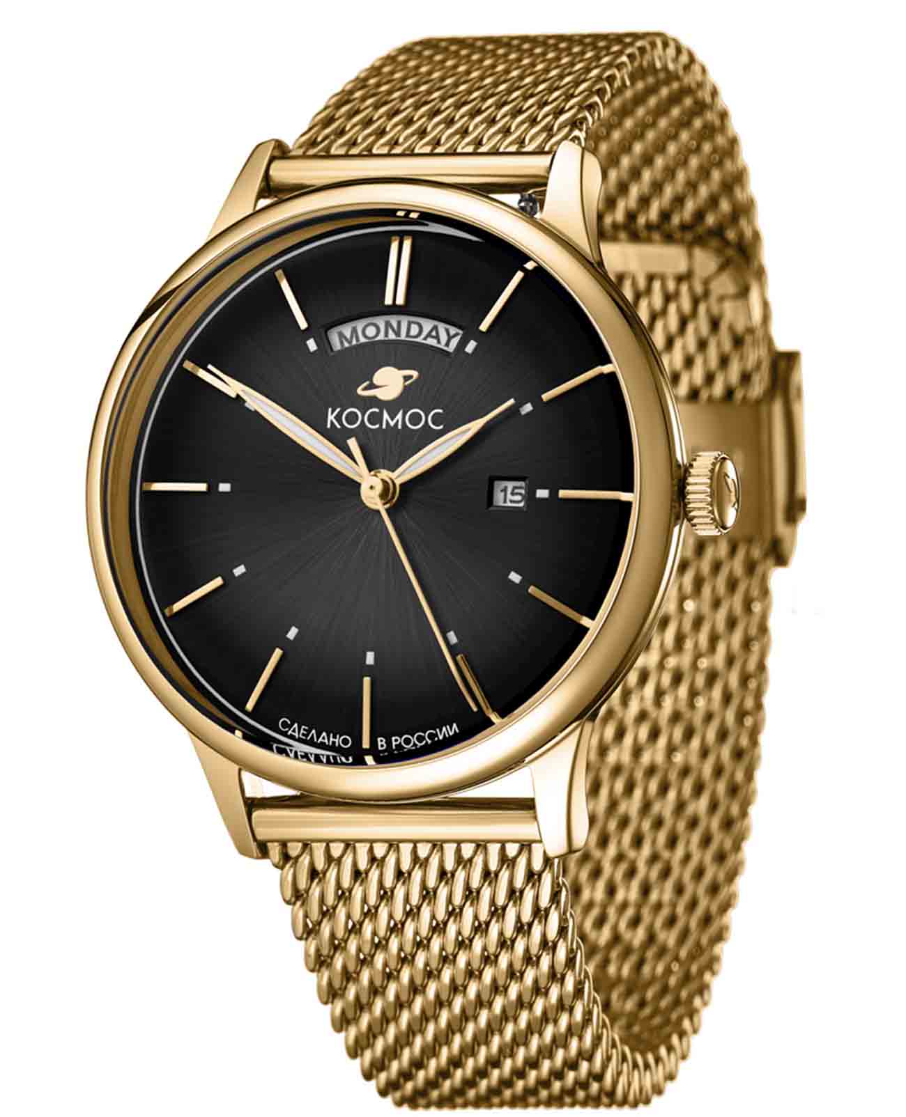 Российские кварцевые часы Космос K011.20.31 с механизмом калибра Miyota оснащены круглым корпусом из стали с PVD-покрытиемPVDУльтратонкое покрытие наносится в технике вакуумного напыления, сочетает в себе нитрид титана особой прочности со слоем золота или оксида хрома. Несёт в себе декоративную или защитную функцию. диаметром 41 мм и защищены прочным минеральным стекломМинеральное стеклоМинеральное стекло представляет собой искусственно выращенный минерал кварца. Такое стекло отличается особой устойчивостью к повреждениям и царапинам. Уступает по некоторым качествам сапфировому стеклу., устойчивым к механическим повреждениям. Черный циферблат дополнен функциями отображения числа и дня недели, а стрелки с люминесцентным покрытиемЛюминесцентное покрытиеПозволяет считывать показания времени в темноте. Производители наносят на стрелки, часовые индексы, безель или поверхность циферблата светонакопительный состав, дающий холодное свечение. обеспечивают хорошую видимость в темное время суток. Часы имеют класс водозащиты 50 метров, позволит защитить корпус от случайных брызг или капель дождя. Модель комплектуется стальным браслетом миланского плетения с PVD-покрытиемPVDУльтратонкое покрытие наносится в технике вакуумного напыления, сочетает в себе нитрид титана особой прочности со слоем золота или оксида хрома. Несёт в себе декоративную или защитную функцию. на раскладном замкеРаскладной замокДанный вариант застежки используется только на часах с металлическим браслетом. Отличительная особенность такого крепления в том, что длина браслета становится универсальной и вы можете самостоятельно отрегулировать нужный вам размер – застежка просто двигается по браслету часов.. Простой и элегантный дизайн делает эти часы универсальным аксессуаром для ценителей комфорта и практичности. Надежный кварцевый механизм обеспечивает точность хода и долговечность модели.