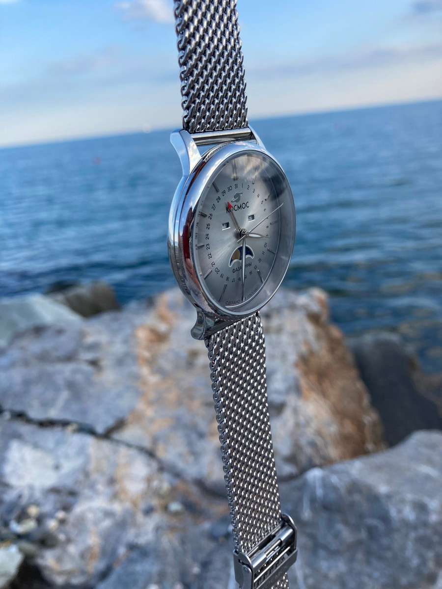 Российские мужские кварцевые часы Космос K 067.10.33 из коллекции Сатурн оснащены механизмом Miyota. Круглый корпус из нержавеющей стали 316L диаметром 41 мм и толщиной 13 мм защищен минеральным стекломМинеральное стеклоМинеральное стекло представляет собой искусственно выращенный минерал кварца. Такое стекло отличается особой устойчивостью к повреждениям и царапинам. Уступает по некоторым качествам сапфировому стеклу.. Серебристый циферблат с серыми элементами и градиентной шлифовкой в стиле солнечных лучей украшен изготовленными вручную индексами, крепящимися на двух штифтах. Часы имеют функции отображения даты центральной стрелкой, дня недели и индикатора фаз луны. Часовая, минутная стрелки, круг по краю циферблата и линия вокруг окошка индикатора фаз луны имеют люминесцентное покрытиеЛюминесцентное покрытиеПозволяет считывать показания времени в темноте. Производители наносят на стрелки, часовые индексы, безель или поверхность циферблата светонакопительный состав, дающий холодное свечение., которое светится в темноте, создавая эффект ореола вокруг Земли. На задней крышке выгравирован фантазийный сюжет — космическая станция будущего. Полированный корпус часов напоминает силуэт летающей тарелки благодаря выпуклым формам стекла и нижней части корпуса. Часы имеют водонепроницаемость 50 метров, позволит защитить корпус от случайных брызг или капель дождя. Модель комплектуется стальным браслетом миланского плетения на раскладном замкеРаскладной замокДанный вариант застежки используется только на часах с металлическим браслетом. Отличительная особенность такого крепления в том, что длина браслета становится универсальной и вы можете самостоятельно отрегулировать нужный вам размер – застежка просто двигается по браслету часов.. Эти часы сочетают в себе классический дизайн, современные технологии и футуристическое вдохновение, делая их идеальным выбором для ценителей точности и элегантности.