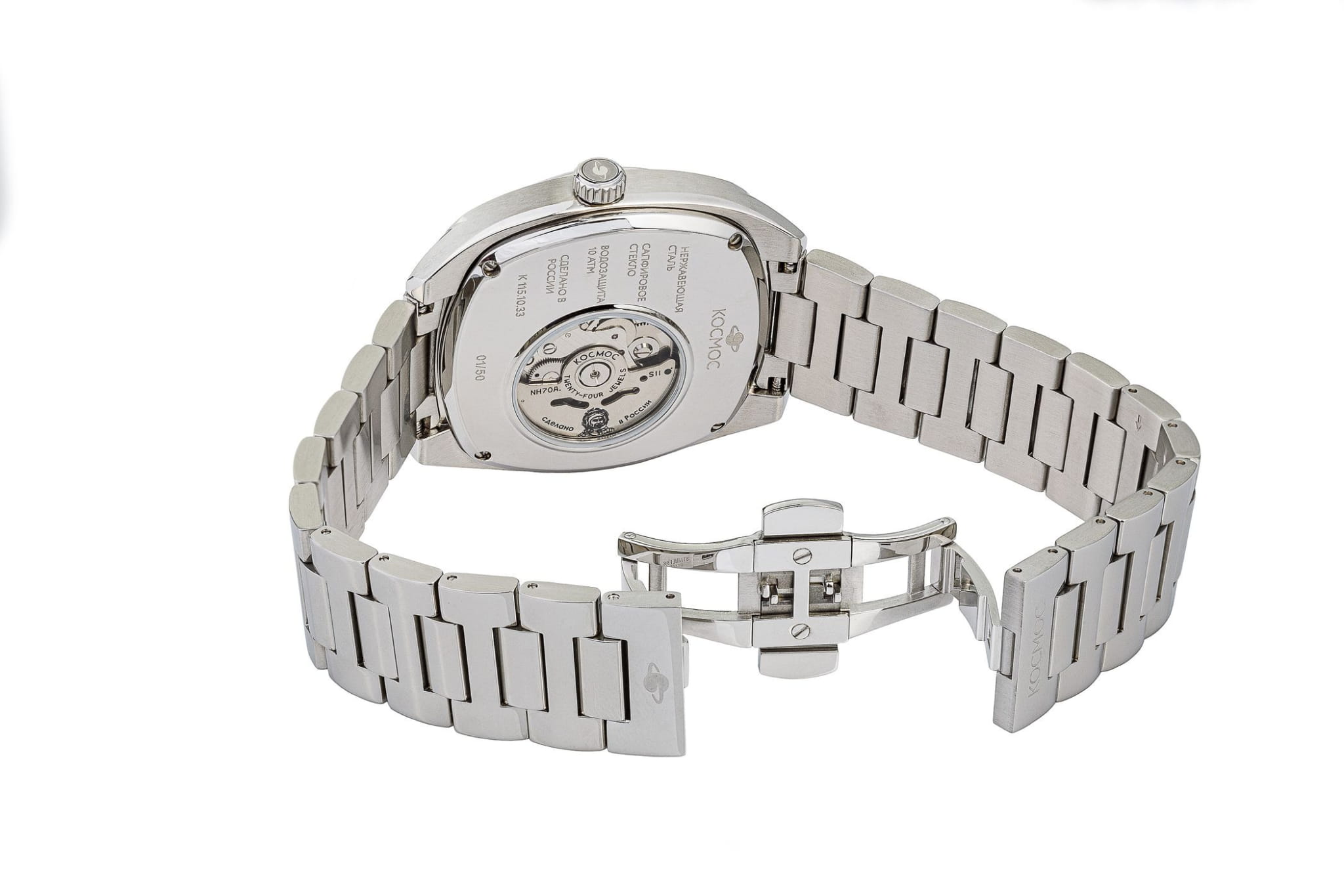 Мужские наручные часы Космос Спутник K 115.10.33 — это уникальная лимитированная серия, созданная в честь исторического запуска первого искусственного спутника Земли. В корпусе необычной круглой формы, выполненном из гипоаллергенной нержавеющей стали 316L, работает надежный механический механизм с автоподзаводом от японской компании Seiko. Прозрачная задняя крышка, закрепленная на четырех винтах, открывает вид на сложный механизм, а на самой крышке указан индивидуальный номер модели в формате хх/50. Скелетонизированный черный циферблат защищен сапфировым стекломСапфировое стеклоПрочный и надёжный материал из кристалла сапфира синтетического происхождения, характеризующийся особой твёрдостью и устойчивостью к царапинам и повреждениям. с антибликовым покрытиемАнтибликовое покрытиеСлой оксида металла в 0,13-0,3 микрон, благодаря которому стекло часов не бликует и не отражает свет. Антибликовое покрытие уменьшает отражение света в 10 раз, обеспечивая отличную читаемость показателей циферблата., которое обеспечивает максимальную устойчивость к царапинам и идеальную видимость в любых условиях. Украшением циферблата служат крупные стрелки с люминесцентным покрытиемЛюминесцентное покрытиеПозволяет считывать показания времени в темноте. Производители наносят на стрелки, часовые индексы, безель или поверхность циферблата светонакопительный состав, дающий холодное свечение., а также специальная апертура, окаймленная элементами, напоминающими антенны Спутника. Часовая и минутная стрелки отлично читаются благодаря своему размеру и светящемуся покрытию. Браслет литой конструкции из нержавеющей стали дополнен удобной застежкой-бабочкой с двумя боковыми кнопкамиЗастёжка "бабочка"Такой вид застёжки дополняется предохранителями, помогающими избежать случайного раскрытия браслета. Обладают изящным исполнением. , что гарантирует надежную фиксацию на руке. Водозащита до 10 атм (WR100) позволяет использовать часы при плавании и других водных видах спорта без акваланга. Коллекция Спутник — это выбор для ценителей истории космических достижений и современных технологий.