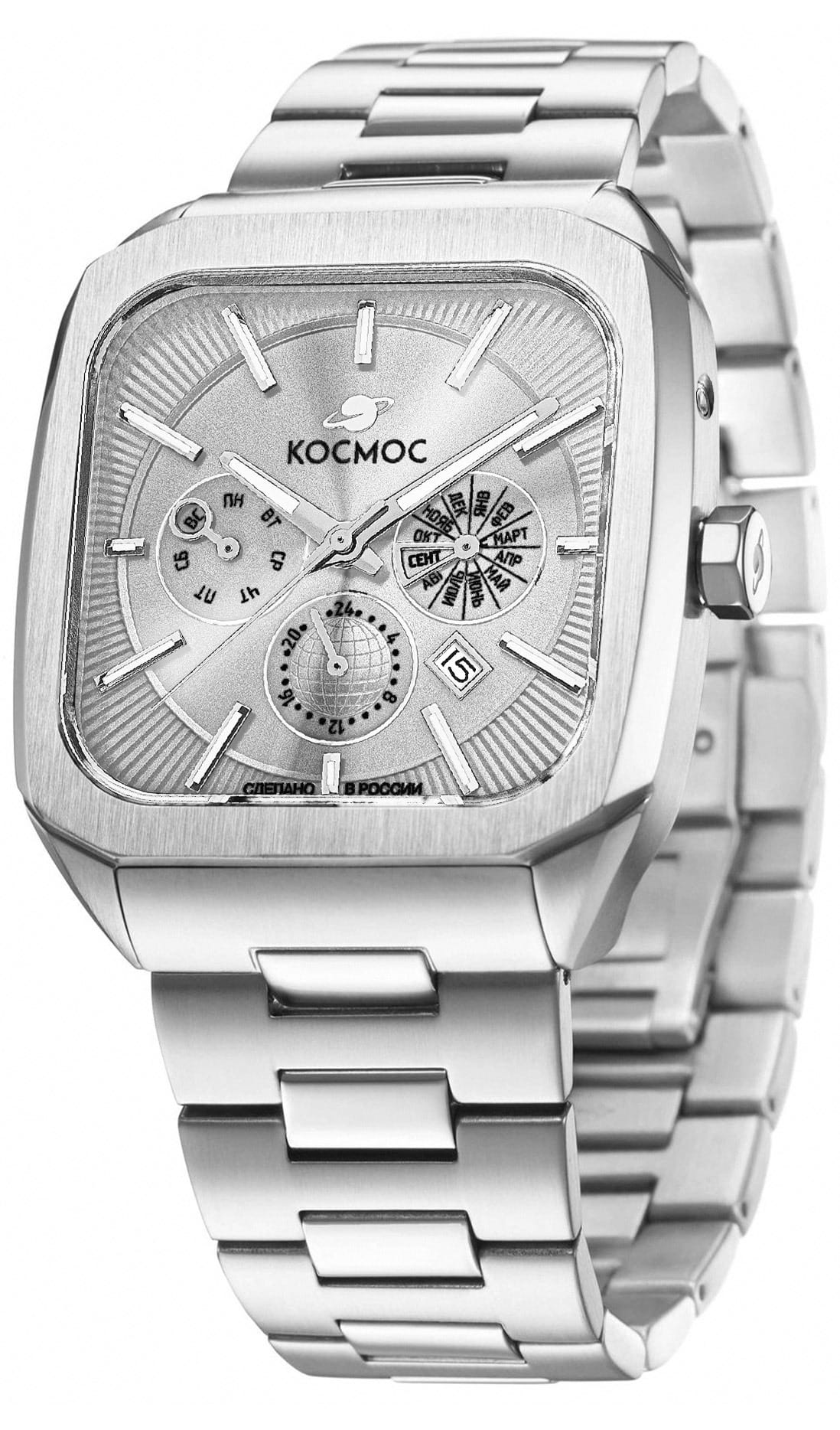 Мужские наручные часы Космос Марсоход II K 219.10.33 — это уникальная лимитированная серия, посвященная аппарату, способному передвигаться по поверхности Красной планеты. Марсоход ассоциируется с брутальностью, мастерством и технической сложностью. Наша страна дважды запускала подобные аппараты еще в 70-х годах прошлого века. Дизайн часов серии Марсоход вдохновлен лучшими работами советских мастеров, сочетая современные технологии часового искусства с обаянием стиля ретро. Корпус в форме квадрата с закругленными углами выполнен из нержавеющей стали украшенной зеркальной полировкой и сатинированием. Удобная заводная головка имеет форму гайки, что добавляет модели индустриальный шарм. Задняя крышка прозрачная, закрепленная на четырех винтах, и позволяет увидеть работу механизма TMI с подвижным ротором, на котором гравируется надпись «Сделано в России». Также здесь представлена гравировка с изображением космонавта, придающая часам особую значимость. Водостойкость достигает 10 атм (WR100), что позволяет использовать часы при плавании и других водных видах спорта. На задней крышке указан индивидуальный номер модели в формате от 01/50 до 50/50. Объемный циферблат состоит из двух уровней. В центре движутся три стрелки, часовая и минутная из которых имеют люминесцентное покрытиеЛюминесцентное покрытиеПозволяет считывать показания времени в темноте. Производители наносят на стрелки, часовые индексы, безель или поверхность циферблата светонакопительный состав, дающий холодное свечение., позволяющее определять время даже в темноте. Также, здесь расположили три дополнительных индикатора: день недели, месяц и время в формате 24-х часов. Для обозначения дня недели и месяца используется кириллица. Окошко даты между 4 и 5 часами выделено накладной рамкой. Циферблат защищен прочным сапфировым стеклом с антибликовым покрытиемСапфировое стеклоПрочный и надёжный материал из кристалла сапфира синтетического происхождения, характеризующийся особой твёрдостью и устойчивостью к царапинам и повреждениям., обеспечивающим отличную читаемость показаний в любых условиях. Второй уровень декорирован гильоше в виде солнечных лучей, на нем закреплены накладные индексы. Браслет изготовлен из литых стальных звеньев нержавеющей стали и оснащен удобной застёжкой «бабочка» с кнопкамиЗастёжка "бабочка"Такой вид застёжки дополняется предохранителями, помогающими избежать случайного раскрытия браслета. Обладают изящным исполнением. , которая сводит к минимуму вероятность потери. Заводная головка, застежка и браслет украшены фирменным логотипом бренда. Коллекция Марсоход — идеальный выбор для ценителей истории космических достижений и современных технологий.