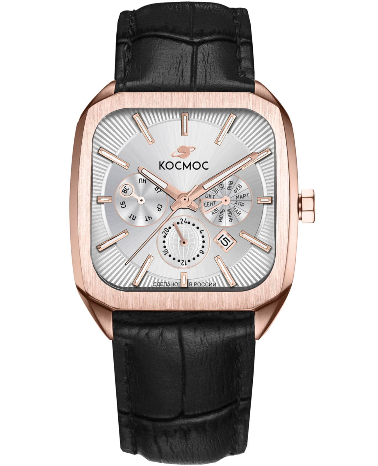 Мужские наручные часы Космос Марсоход II K 219.41.33 — это уникальная лимитированная серия, посвященная аппарату, способному передвигаться по поверхности Красной планеты. Марсоход ассоциируется с брутальностью, мастерством и технической сложностью. Наша страна дважды запускала подобные аппараты еще в 70-х годах прошлого века. Дизайн часов серии Марсоход вдохновлен лучшими работами советских мастеров, сочетая современные технологии часового искусства с обаянием стиля ретро. Корпус в форме квадрата с закругленными углами выполнен из нержавеющей стали с PVDPVDУльтратонкое покрытие наносится в технике вакуумного напыления, сочетает в себе нитрид титана особой прочности со слоем золота или оксида хрома. Несёт в себе декоративную или защитную функцию. покрытием украшен зеркальной полировкой и сатинированием. Удобная заводная головка имеет форму гайки, что добавляет модели индустриальный шарм. Задняя крышка прозрачная, закрепленная на четырех винтах, и позволяет увидеть работу механизма TMI с подвижным ротором, на котором гравируется надпись «Сделано в России». Также здесь представлена гравировка с изображением космонавта, придающая часам особую значимость. Водостойкость достигает 10 атм (WR100), что позволяет использовать часы при плавании и других водных видах спорта. На задней крышке указан индивидуальный номер модели в формате от 01/50 до 50/50. Объемный циферблат состоит из двух уровней. В центре движутся три стрелки, часовая и минутная из которых имеют люминесцентное покрытиеЛюминесцентное покрытиеПозволяет считывать показания времени в темноте. Производители наносят на стрелки, часовые индексы, безель или поверхность циферблата светонакопительный состав, дающий холодное свечение., позволяющее определять время даже в темноте. Также, здесь расположили три дополнительных индикатора: день недели, месяц и время в формате 24-х часов. Для обозначения дня недели и месяца используется кириллица. Окошко даты между 4 и 5 часами выделено накладной рамкой. Циферблат защищен прочным сапфировым стеклом с антибликовым покрытиемСапфировое стеклоПрочный и надёжный материал из кристалла сапфира синтетического происхождения, характеризующийся особой твёрдостью и устойчивостью к царапинам и повреждениям., обеспечивающим отличную читаемость показаний в любых условиях. Второй уровень декорирован гильоше в виде солнечных лучей, на нем закреплены накладные индексы. Браслет изготовлен из натуральной кожи черного цвета и оснащен удобной застёжкой «бабочка» с кнопкамиЗастёжка "бабочка"Такой вид застёжки дополняется предохранителями, помогающими избежать случайного раскрытия браслета. Обладают изящным исполнением. , которая сводит к минимуму вероятность потери. Заводная головка, застежка и браслет украшены фирменным логотипом бренда. Коллекция Марсоход — идеальный выбор для ценителей истории космических достижений и современных технологий.