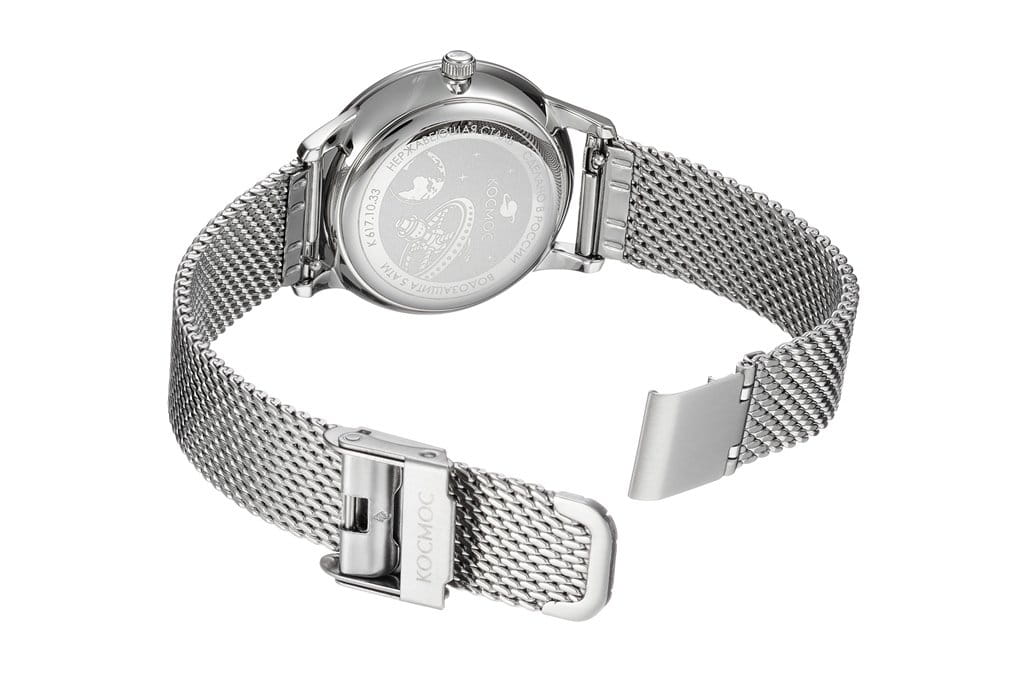 Женские наручные часы Космос Солнце и Луна K 617.10.36 — это сочетание традиций часового искусства 60-70-х годов и футуристического дизайна, вдохновленного космическими исследованиями. Они не только служат напоминанием о прошлом, но и побуждают задуматься о будущем, позволяя наслаждаться качеством и смыслом, вложенными в каждую деталь. Полированный корпус часов выполнен в виде силуэта летающей тарелки благодаря выпуклым формам стекла и нижней части корпуса. Стальные ушки, которые напоминают опоры летающей тарелки, завершает общий образ. На задней крышке часов выгравирован фантазийный сюжет – космическая станция будущего. Элегантные женские часы из серии Солнце и Луна выделяются функцией день/ночь. Циферблат выполнен в ретро-стиле с выгнутыми краями, что требует применения сложных технологий в производстве. Циферблаты такой формы были характерны для часов прошлых эпох. Кончик секундной стрелки изогнут в соответствии с формой циферблата. На градиентном выпуклом циферблате выполнена шлифовка в стиле солнечных лучей, а также размещены индексы, изготовленные вручную и закрепленные на двух штифтах. Часовая и минутная стрелки, а также круг по краю циферблата, напоминающий ореол Земли, с люминесцентным покрытиемЛюминесцентное покрытиеПозволяет считывать показания времени в темноте. Производители наносят на стрелки, часовые индексы, безель или поверхность циферблата светонакопительный состав, дающий холодное свечение., которое светится в темноте, создавая завораживающий эффект. Форма минерального стеклаМинеральное стеклоМинеральное стекло представляет собой искусственно выращенный минерал кварца. Такое стекло отличается особой устойчивостью к повреждениям и царапинам. Уступает по некоторым качествам сапфировому стеклу. тщательно продумана: оно выгнуто как снаружи, так и изнутри. Такое решение позволяет избежать искажения изображения на циферблате, в отличие от стекла с прямой внутренней частью, которое создает эффект линзы. Модель оснащена гибким и прочным браслетом миланского плетения. Заводная головка, застежка и ремешок украшены фирменным логотипом.