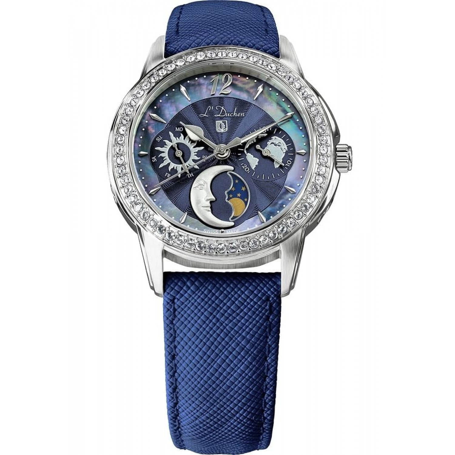 Женские кварцевые часы L'Duchen из коллекции Celeste — это изысканный аксессуар, сочетающий швейцарское качество и элегантный дизайн. Корпус круглой формы выполнен из стали и защищён сапфировым стекломСапфировое стеклоПрочный и надёжный материал из кристалла сапфира синтетического происхождения, характеризующийся особой твёрдостью и устойчивостью к царапинам и повреждениям.. Циферблат синего цвета украшен перламутровым кольцом по краю, придающим модели уникальность и благородное сияние. Центральная часть оформлена волнообразным гильоше, индикатор дня недели представлен в виде солнечного диска, а даты — изображением карты Земли. Указатель выделен металлической рамкой и дополнен объёмным элементом в виде месяца. Широкий полированный безельБезельВнешний ободок, закрепляющий стекло. В спортивных часах так называется поворотное кольцо с делениями на циферблате, выполняет роль таймера – замеряет отрезки времени на шкале. Неподвижный безель – элемент декора. Однонаправленно вращающийся безель на дайверских часах позволяет фиксировать моменты погружения и выныривания на поверхность. инкрустирован фианитами, эффектно переливающимися на свету. Часы оснащены ремешком из натуральной кожи синего цвета с сафьяновым тиснением и застёжкой «бабочка» с кнопкамиЗастёжка "бабочка"Такой вид застёжки дополняется предохранителями, помогающими избежать случайного раскрытия браслета. Обладают изящным исполнением. , украшенной логотипом бренда. Водонепроницаемость 50 м позволяет использовать часы в повседневных условиях, защищая от случайных брызг и капель дождя.