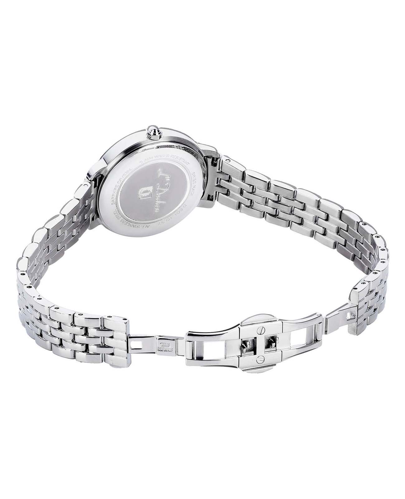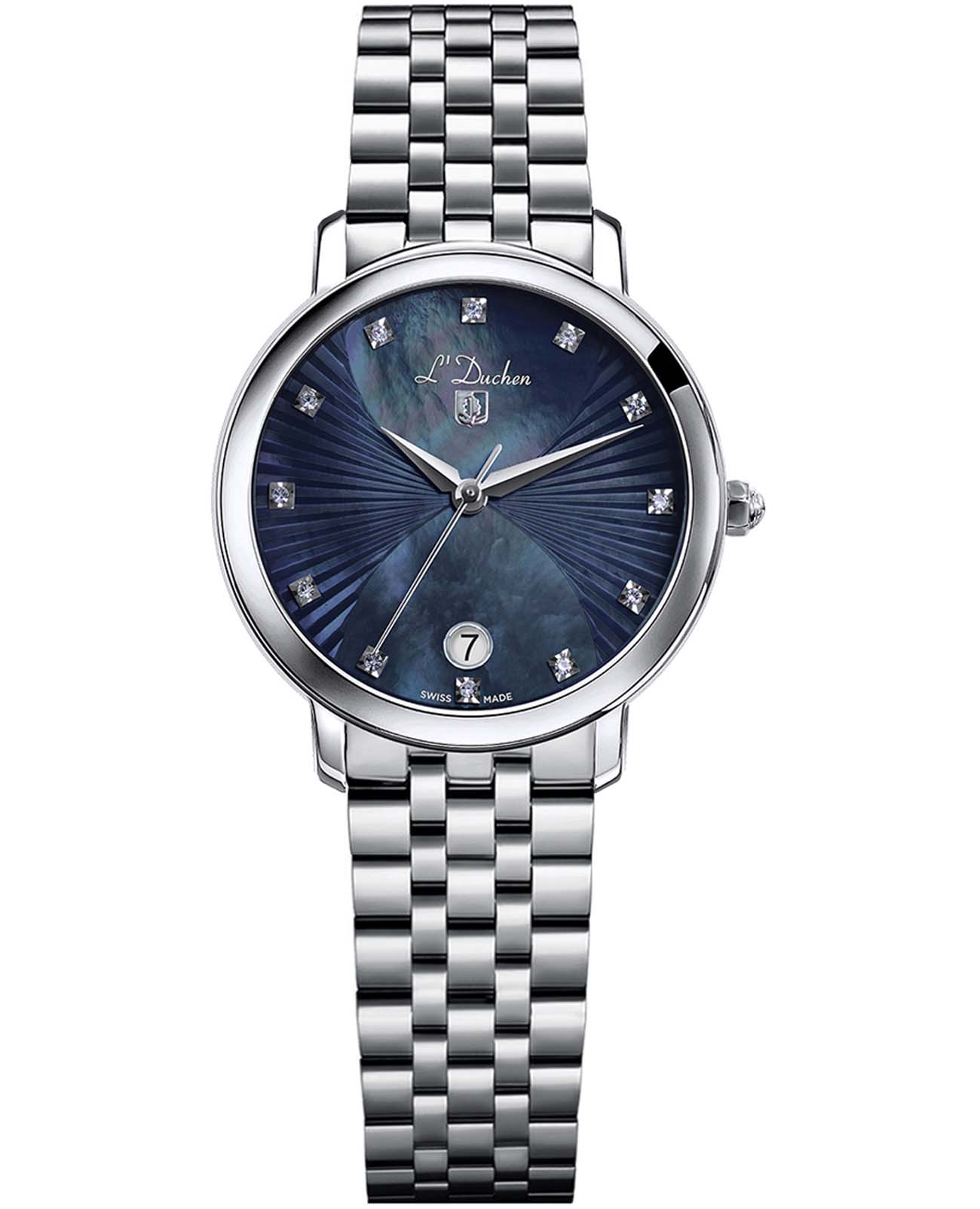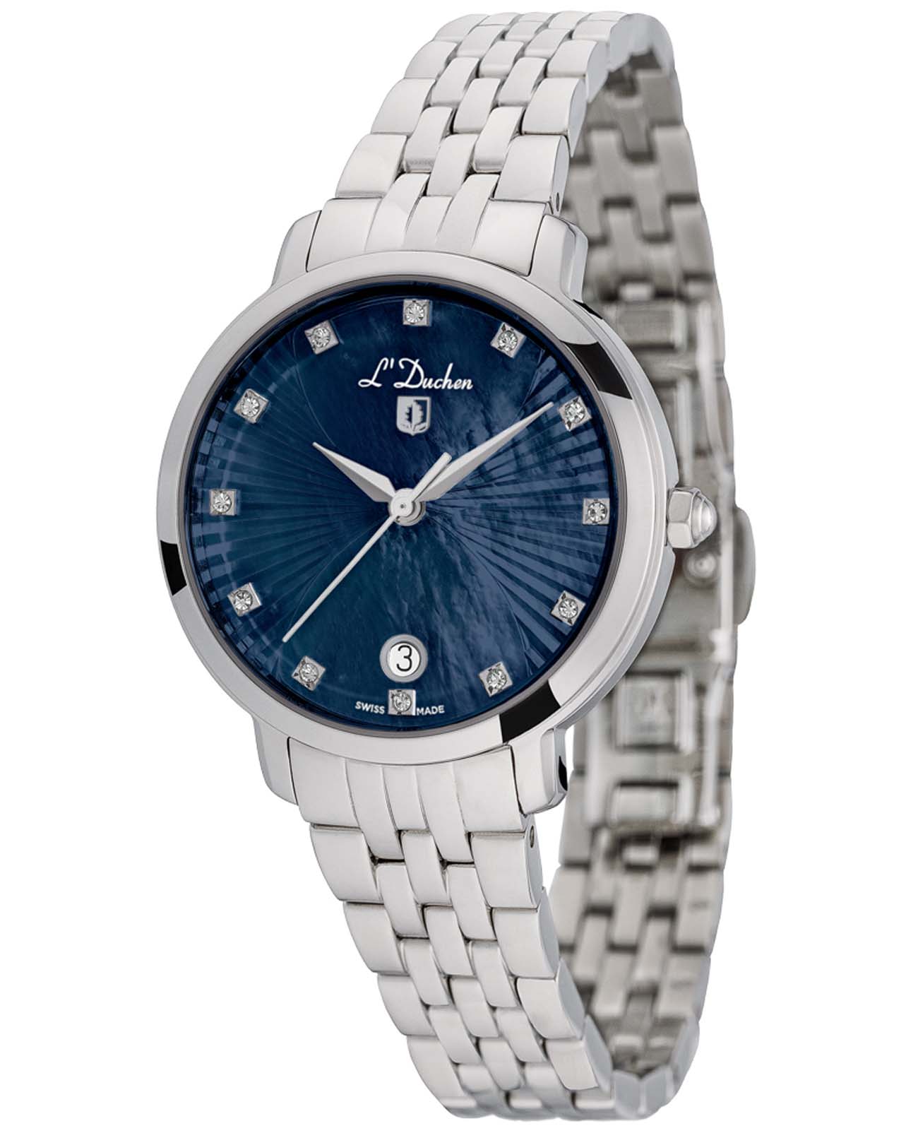 Женские швейцарские часы L'Duchen Eternity D 801.10.37, кварцевый механизм с высокой точностью. Сапфировое стеклоСапфировое стеклоПрочный и надёжный материал из кристалла сапфира синтетического происхождения, характеризующийся особой твёрдостью и устойчивостью к царапинам и повреждениям. устойчивое к появлению царапин, обладающее высокой прозрачностью. Корпус часов выполнен из нержавеющей стали. Окошко даты находится в положении 6 часов. Класс водозащиты: 50 метров, позволит защитить корпус от случайных брызг или капель дождя. Стальной браслет на застёжке «бабочка» с кнопкамиЗастёжка "бабочка"Такой вид застёжки дополняется предохранителями, помогающими избежать случайного раскрытия браслета. Обладают изящным исполнением. .