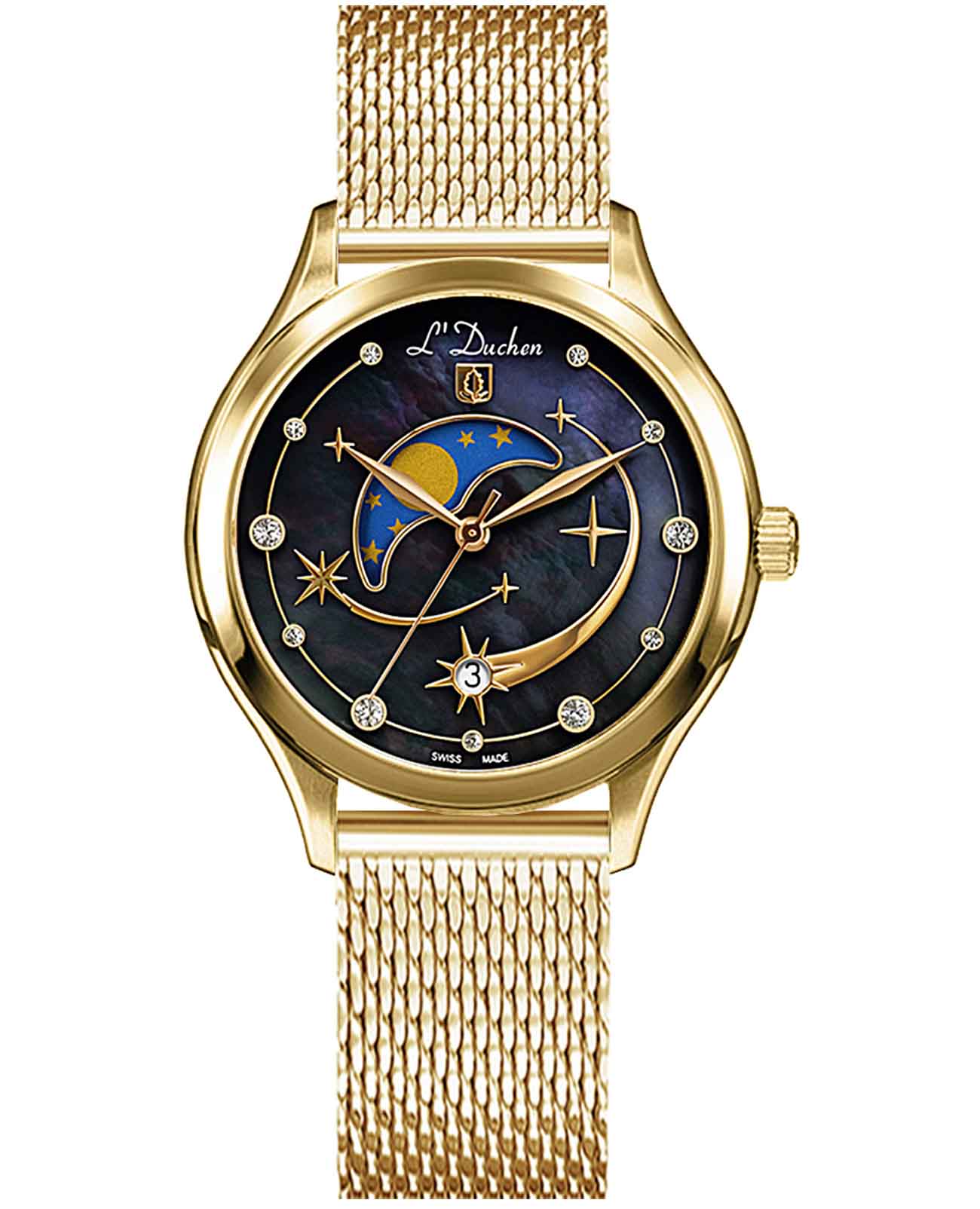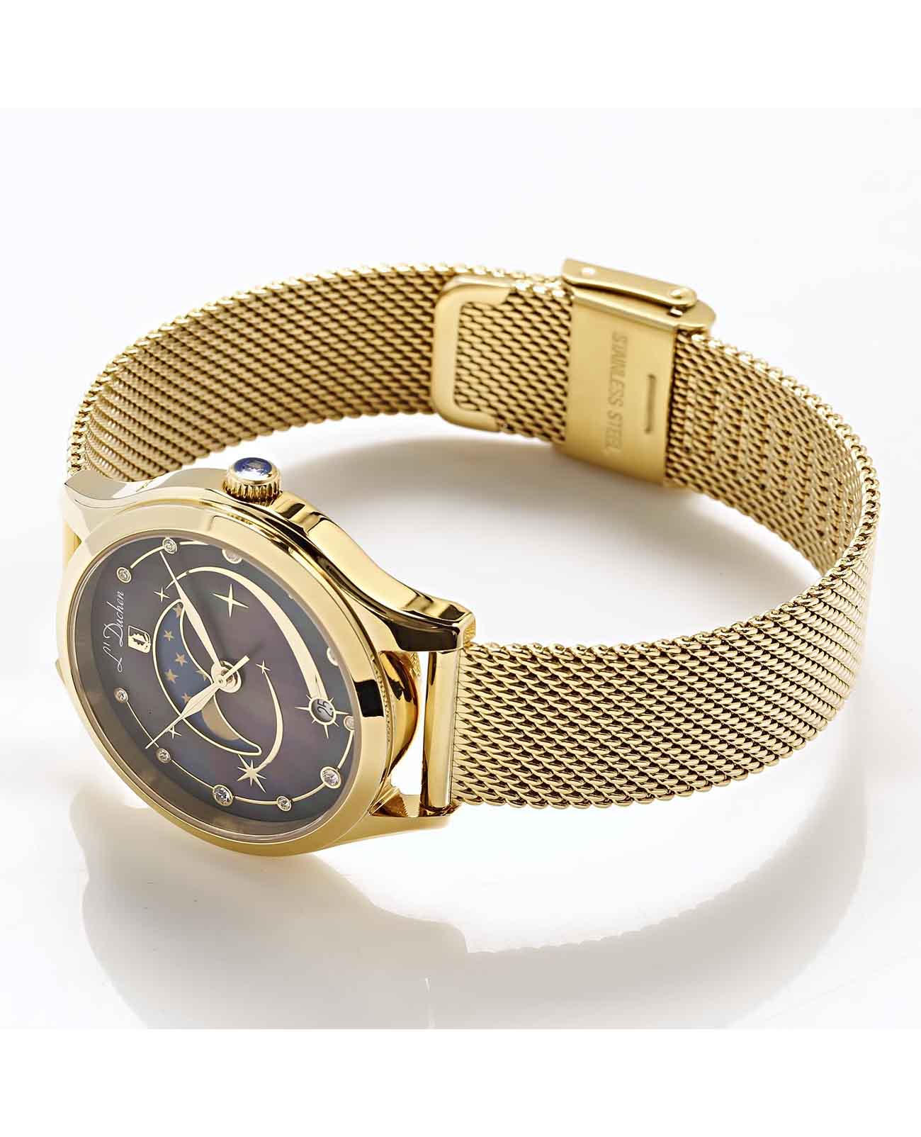 Женские швейцарские часы L'Duchen Perseides D 837.21.41 M, кварцевый механизм с высокой точностью. Сапфировое стеклоСапфировое стеклоПрочный и надёжный материал из кристалла сапфира синтетического происхождения, характеризующийся особой твёрдостью и устойчивостью к царапинам и повреждениям. устойчивое к появлению царапин, обладающее высокой прозрачностью. Корпус часов выполнен из нержавеющей стали с PVD-покрытиемPVDУльтратонкое покрытие наносится в технике вакуумного напыления, сочетает в себе нитрид титана особой прочности со слоем золота или оксида хрома. Несёт в себе декоративную или защитную функцию.. Циферблат украшен фианитами. Класс водозащиты: 50 метров, позволит защитить корпус от случайных брызг или капель дождя. Стальной браслет миланского плетения с PVD-покрытиемPVDУльтратонкое покрытие наносится в технике вакуумного напыления, сочетает в себе нитрид титана особой прочности со слоем золота или оксида хрома. Несёт в себе декоративную или защитную функцию. на раскладном замкеРаскладной замокДанный вариант застежки используется только на часах с металлическим браслетом. Отличительная особенность такого крепления в том, что длина браслета становится универсальной и вы можете самостоятельно отрегулировать нужный вам размер – застежка просто двигается по браслету часов..
