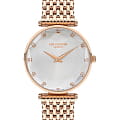 Женские наручные часы Lee Cooper LC07410.430 — это элегантная модель с утончённым дизайном. Корпус диаметром 33 мм выполнен из нержавеющей стали с IP-покрытиемIP-покрытиеМетод ионного напыления. Демонстрирует повышенную устойчивость к истиранию, окислению и химическим веществам. Под воздействием высокого давления и температуры около 1500°C молекулы металла надёжно соединяются с частицами корпуса часов., что придаёт часам изысканный вид. Перламутровый циферблат украшен изящными метками из кристаллов и стрелками, обеспечивая удобное считывание времени. Циферблат защищён минеральным стекломМинеральное стеклоМинеральное стекло представляет собой искусственно выращенный минерал кварца. Такое стекло отличается особой устойчивостью к повреждениям и царапинам. Уступает по некоторым качествам сапфировому стеклу., устойчивым к царапинам. Часы работают на кварцевом механизме, обеспечивая точность хода. Браслет из нержавеющей стали с раскладной застёжкойРаскладная застёжкаТакой тип застёжки используется только на браслетах из металла. Она никогда не раскрывается полностью, происходит разделение на 2 и более частей. Раскладывающая застёжка снизит вероятность потери часов к минимуму. гарантирует комфортное ношение и надёжную фиксацию на запястье. Водозащита 30 метров защищает часы от случайных брызг и дождя, делая их подходящими для повседневного использования.