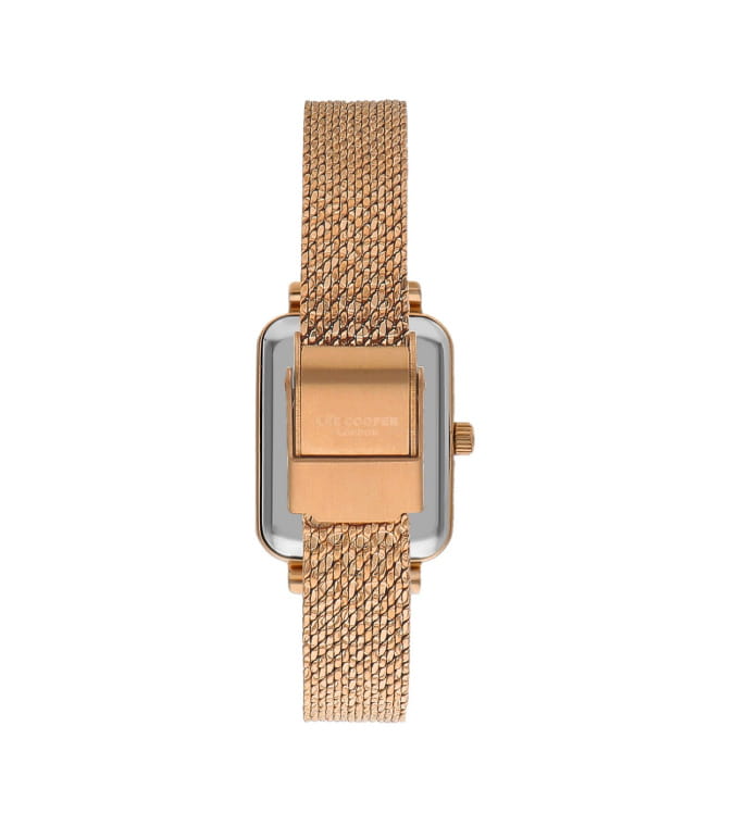 Женские наручные часы Lee Cooper LC07815.410 представляют собой элегантную модель, сочетающую стильный дизайн и практичность. Корпус часов выполнен из суперметалла с IP-покрытиемIP-покрытиеМетод ионного напыления. Демонстрирует повышенную устойчивость к истиранию, окислению и химическим веществам. Под воздействием высокого давления и температуры около 1500°C молекулы металла надёжно соединяются с частицами корпуса часов. цвета розового золота, что придает им изысканный и благородный вид. Циферблат розового цвета украшен индексами и стрелками с IP-покрытием розового золота, гармонично дополняя классический дизайн модели. Форма корпуса прямоугольная с размерами 20,5 x 26 мм, что делает часы компактными и удобными для повседневной носки. Для защиты циферблата используется минеральное стеклоМинеральное стеклоМинеральное стекло представляет собой искусственно выращенный минерал кварца. Такое стекло отличается особой устойчивостью к повреждениям и царапинам. Уступает по некоторым качествам сапфировому стеклу., устойчивое к царапинам. Часы оснащены точным кварцевым механизмом японского производства, обеспечивающим надежность и высокую точность хода. Браслет изготовлен из нержавеющей стали с золотистым IP-покрытием, создавая нежный и женственный образ. Застежка выполнена в виде раскладного замкаРаскладной замокДанный вариант застежки используется только на часах с металлическим браслетом. Отличительная особенность такого крепления в том, что длина браслета становится универсальной и вы можете самостоятельно отрегулировать нужный вам размер – застежка просто двигается по браслету часов., гарантирующего комфортное и безопасное ношение. Модель обладает водозащитой до 30 метров (3 ATM), что позволяет использовать часы в повседневной жизни, включая контакт с водой при мытье рук или дожде. Эти часы станут идеальным выбором для женщин, ценящих стиль, качество и практичность.