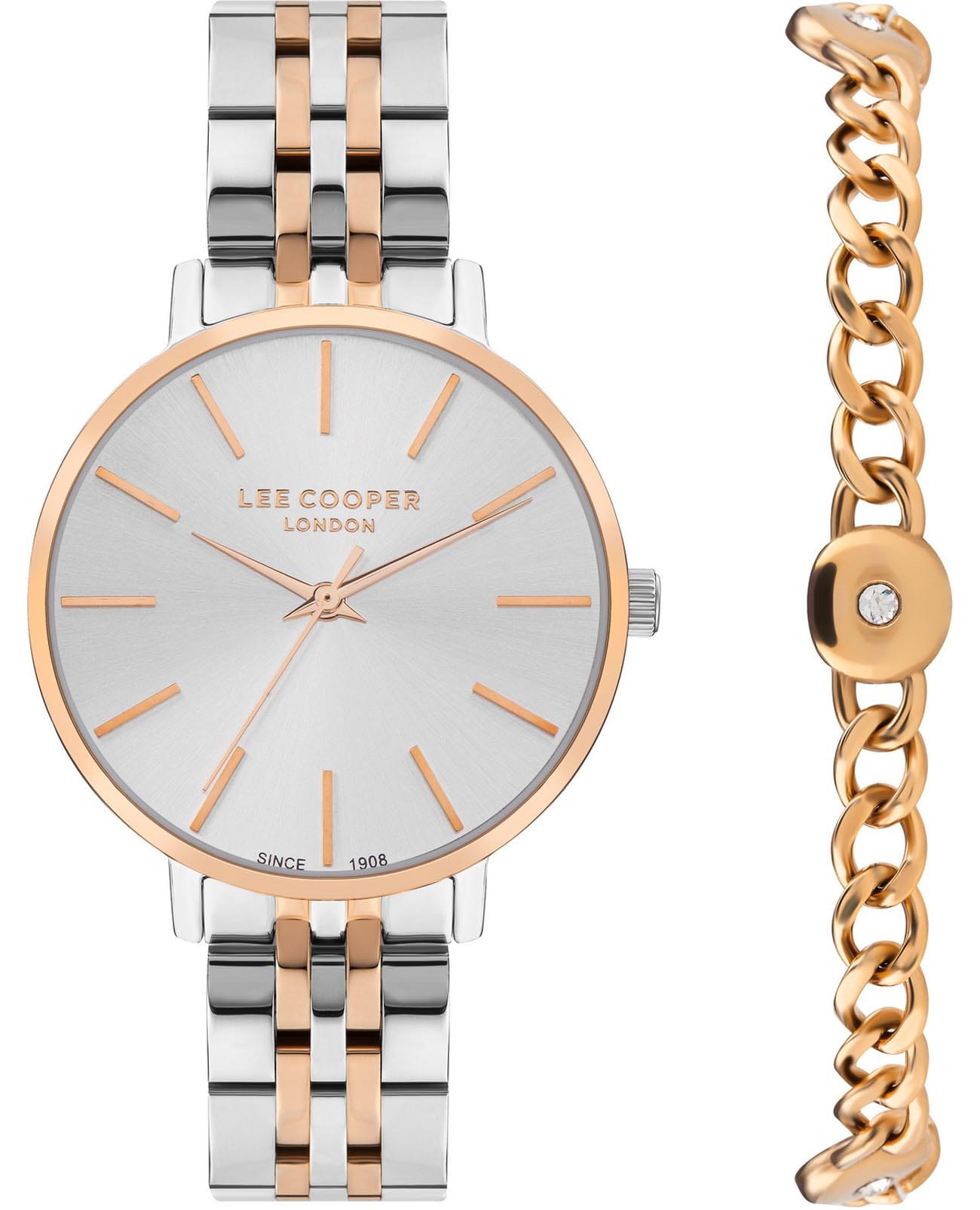Женские часы Lee Cooper LC07857.530 — это стильное сочетание элегантности и современного дизайна. Изящный круглый корпус диаметром 34 мм выполнен из суперметалла с безелемБезельВнешний ободок, закрепляющий стекло. В спортивных часах так называется поворотное кольцо с делениями на циферблате, выполняет роль таймера – замеряет отрезки времени на шкале. Неподвижный безель – элемент декора. Однонаправленно вращающийся безель на дайверских часах позволяет фиксировать моменты погружения и выныривания на поверхность. с IP-покрытиемIP-покрытиеМетод ионного напыления. Демонстрирует повышенную устойчивость к истиранию, окислению и химическим веществам. Под воздействием высокого давления и температуры около 1500°C молекулы металла надёжно соединяются с частицами корпуса часов. золотого цвета, что придает модели особый блеск. Серебристый циферблат защищен минеральным стекломМинеральное стеклоМинеральное стекло представляет собой искусственно выращенный минерал кварца. Такое стекло отличается особой устойчивостью к повреждениям и царапинам. Уступает по некоторым качествам сапфировому стеклу., обеспечивающим устойчивость к царапинам. Метки в виде штрихов. Часы оснащены надежным кварцевым механизмом, а стальной браслет с частичным IP-покрытиемIP-покрытиеМетод ионного напыления. Демонстрирует повышенную устойчивость к истиранию, окислению и химическим веществам. Под воздействием высокого давления и температуры около 1500°C молекулы металла надёжно соединяются с частицами корпуса часов. на раскладной застёжкеРаскладная застёжкаТакой тип застёжки используется только на браслетах из металла. Она никогда не раскрывается полностью, происходит разделение на 2 и более частей. Раскладывающая застёжка снизит вероятность потери часов к минимуму. гарантирует комфортную посадку на запястье. Водозащита 30 метров защищает модель от случайных брызг и дождя. В комплекте к часам идет дополнительный браслет. Lee Cooper  — отличный выбор для тех, кто ценит утонченность и качество.