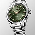 Циферблат глубокого зелёного оттенка оформлен с сатинированной отделкой «солнечные лучи» и украшен накладными индексами и стрелками с покрытием Swiss Super‑LumiNova. Для защиты от повреждений и чёткого отображения показаний используется куполообразное сапфировое стеклоСапфировое стеклоПрочный и надёжный материал из кристалла сапфира синтетического происхождения, характеризующийся особой твёрдостью и устойчивостью к царапинам и повреждениям. с антибликовым покрытием.