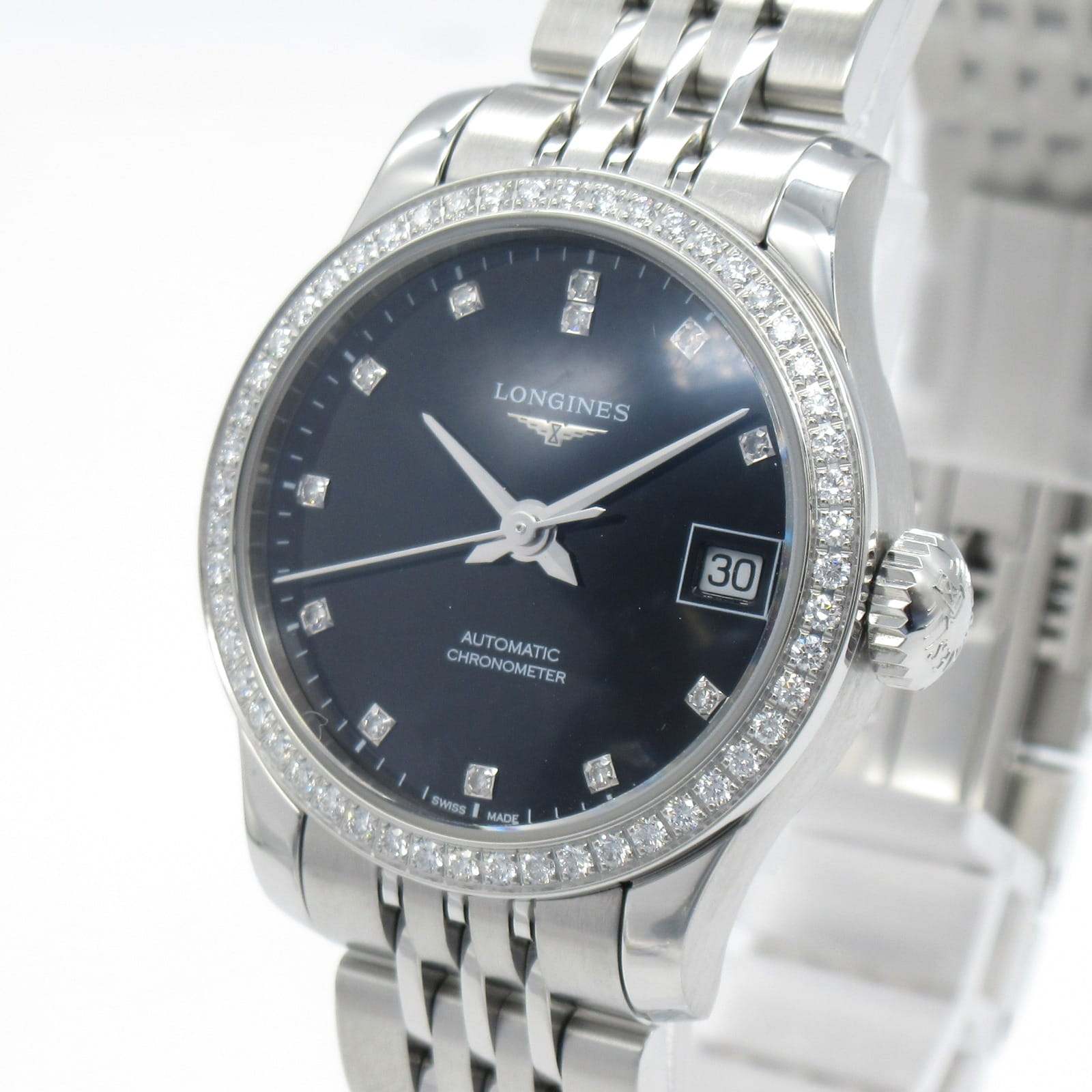 Женские механические швейцарские часы с бриллиантами Longines Record Collection L2.320.0.57.6, механический механизм (автоматический калибр) с высокой точностью. Сапфировое стеклоСапфировое стеклоПрочный и надёжный материал из кристалла сапфира синтетического происхождения, характеризующийся особой твёрдостью и устойчивостью к царапинам и повреждениям. устойчивое к появлению царапин, обладающее высокой прозрачностью. БезельБезельВнешний ободок, закрепляющий стекло. В спортивных часах так называется поворотное кольцо с делениями на циферблате, выполняет роль таймера – замеряет отрезки времени на шкале. Неподвижный безель – элемент декора. Однонаправленно вращающийся безель на дайверских часах позволяет фиксировать моменты погружения и выныривания на поверхность. с 52 бриллиантами группы Top Wesselton IF-VVS общим весом 0.405 карата. Прозрачная задняя крышка с сапфировым стекломСапфировое стеклоПрочный и надёжный материал из кристалла сапфира синтетического происхождения, характеризующийся особой твёрдостью и устойчивостью к царапинам и повреждениям.. Посеребренные полированные стрелки и бриллиантовые метки. Циферблат с 12 бриллиантами группы Top Wesselton VS-SI общим весом 0.034 карата. Автоматический механизм с частотой баланса 28 800 полуколебаний в час и монокристаллической кремниевой спиралью баланса, обеспечивающей запас хода около 45 часов. Специальная функция - хронометр c сертификацией COSCСертификат COSCОфициальный сертификат, подтверждающий то, что часы ходят с особо высокой точностью. Для получения документа часы подвергаются тестовым испытаниям, разработанным швейцарским институтом тестирования хронометров COSC. Допустимая норма для механических часов -4/+6 секунд в день, для кварцевых моделей +/- 0,07 секунд в день.. Класс водозащиты: 30 метров, позволит защитить корпус от случайных брызг или капель дождя. Корпус часов изготовлен из стали. Стальной браслет на застёжке-бабочке с кнопкамиЗастёжка "бабочка"Такой вид застёжки дополняется предохранителями, помогающими избежать случайного раскрытия браслета. Обладают изящным исполнением. .