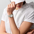 Женские швейцарские механические часы с автоподзаводом Longines Master Collection L2.357.5.87.7. Сапфировое стеклоСапфировое стеклоПрочный и надёжный материал из кристалла сапфира синтетического происхождения, характеризующийся особой твёрдостью и устойчивостью к царапинам и повреждениям. устойчивое к появлению царапин, обладающее высокой прозрачностью. Корпус часов изготовлен из нержавеющей стали. БезельБезельВнешний ободок, закрепляющий стекло. В спортивных часах так называется поворотное кольцо с делениями на циферблате, выполняет роль таймера – замеряет отрезки времени на шкале. Неподвижный безель – элемент декора. Однонаправленно вращающийся безель на дайверских часах позволяет фиксировать моменты погружения и выныривания на поверхность. с 18-каратным золотом18-каратное золотоОбозначение по каратной системе пробирования, оно показывает, сколько драгоценного металла содержится в изделии. 18 карат - в составе 75% чистого золота, соответствует 750 пробе.