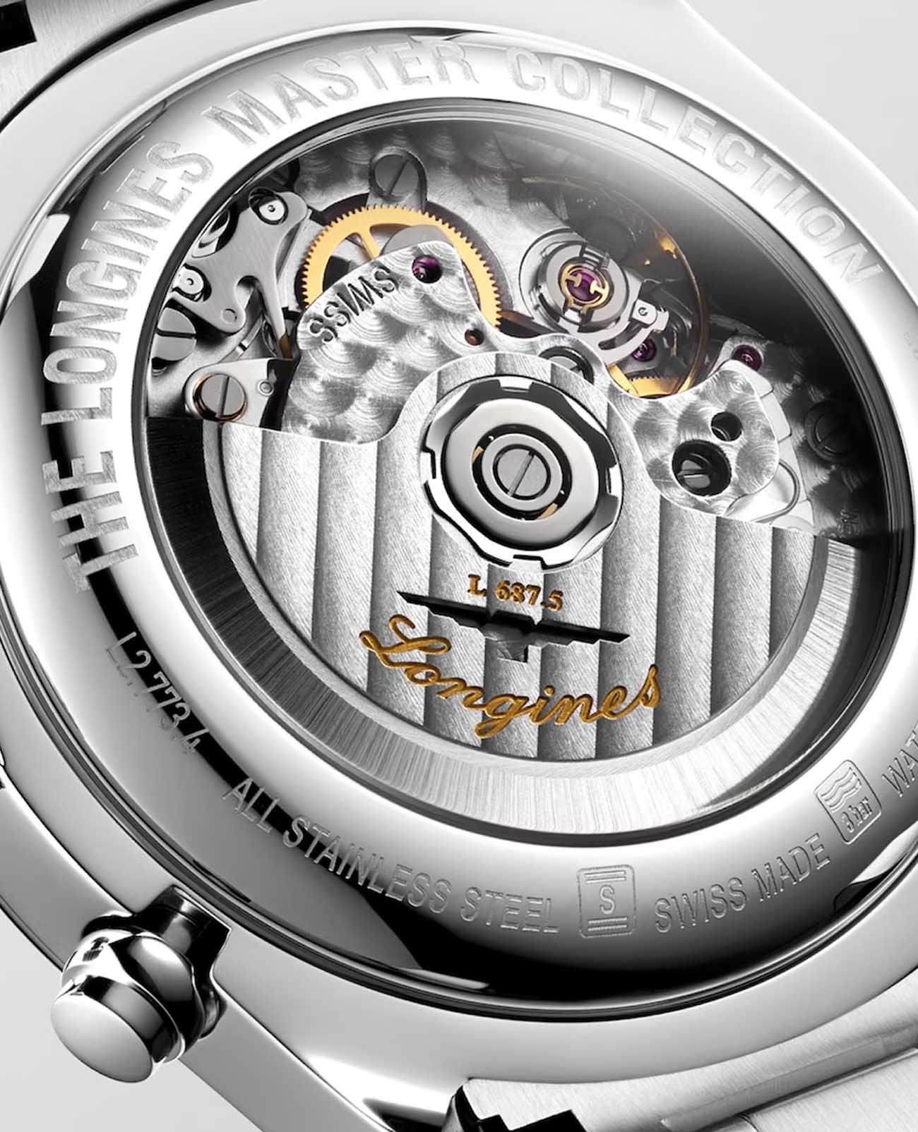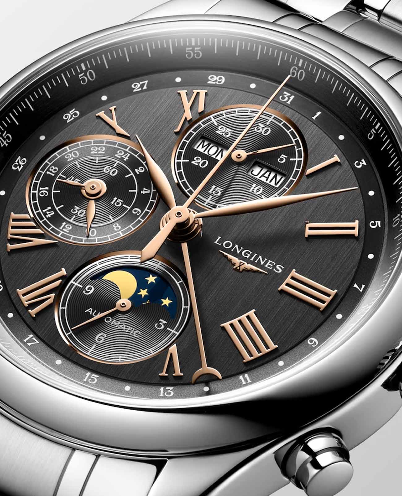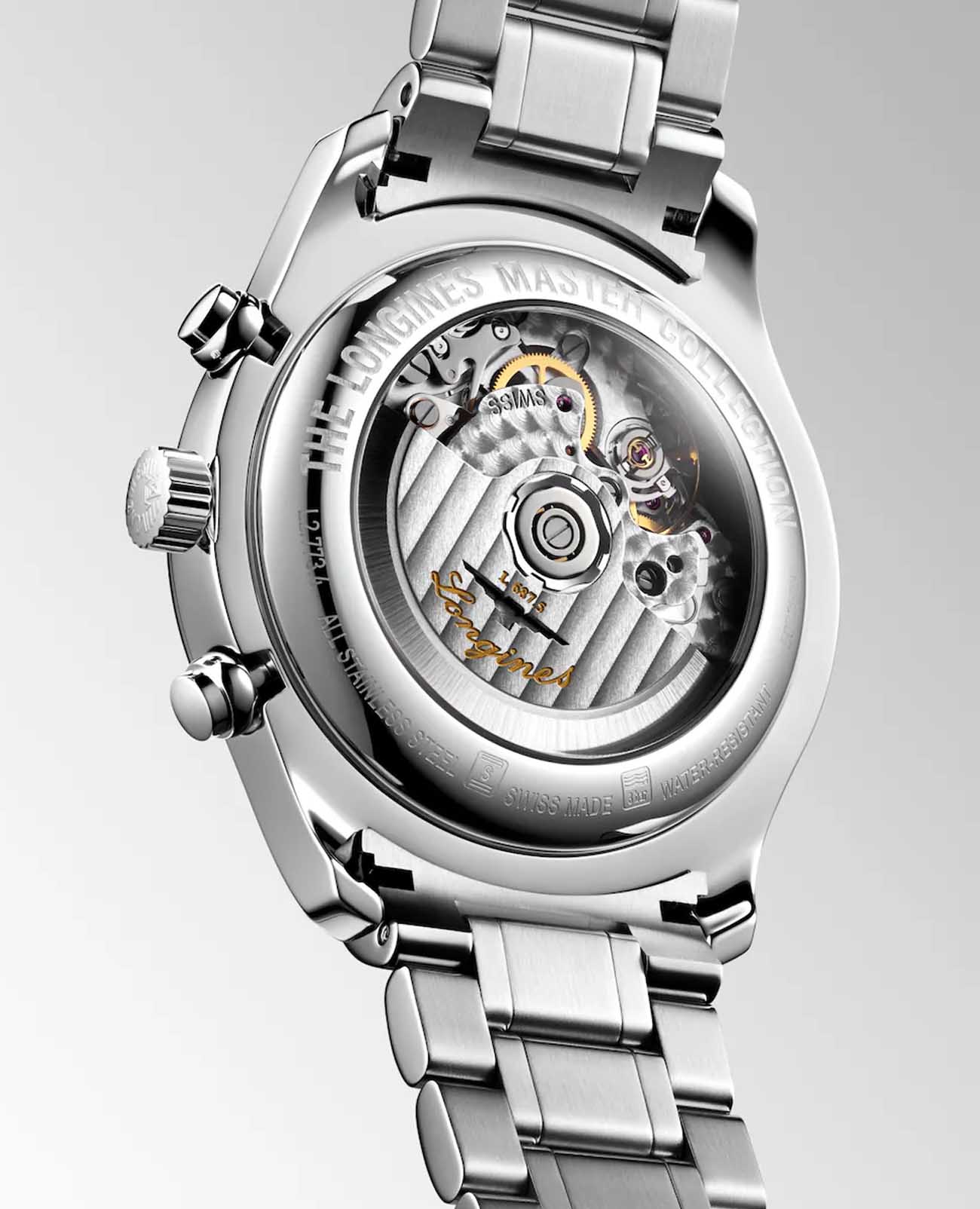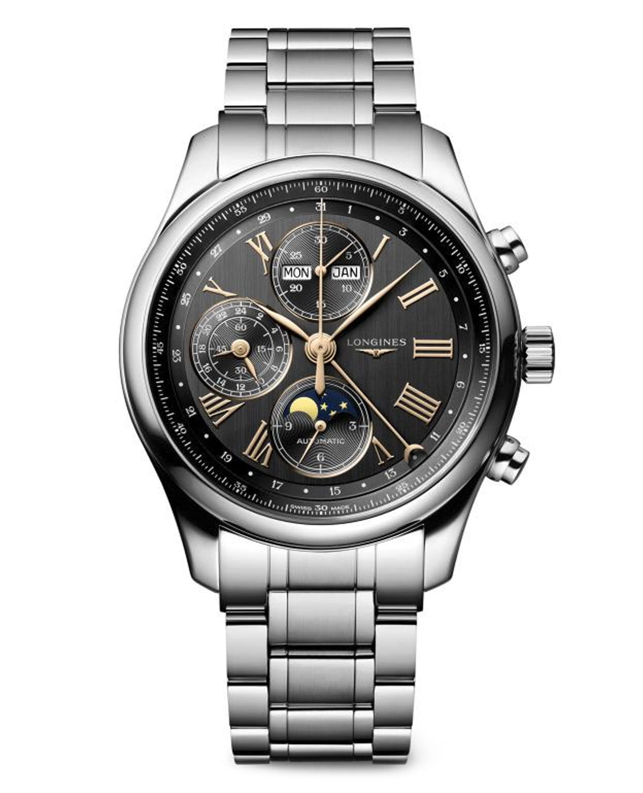 Мужсике швейцарские механические часы-хронографХронографФункция позволяет измерять отрезки времени с особой точностью: часы, минуты, секунды. Верным признаком хронографа является наличие на циферблате 3 дополнительных окошек-счётчиков. с автоподзаводом Longines Master Collection L2.773.4.61.6. Сапфировое стеклоСапфировое стеклоПрочный и надёжный материал из кристалла сапфира синтетического происхождения, характеризующийся особой твёрдостью и устойчивостью к царапинам и повреждениям. устойчивое к появлению царапин, обладающее высокой прозрачностью. Корпус часов изготовлен из нержавеющей стали. Функции: часы, минуты, малая секундная стрелка с 24-часовым индикатором в положении 9 часов. Дату показывает центральная стрелка с серповидным наконечником. Указатель фаз Луны в положении 6 часов. Прозрачная задняя крышка. Класс водозащиты: 30 метров, позволит защитить корпус от случайных брызг или капель дождя. Стальной браслет на застёжке «бабочка» с кнопкамиЗастёжка "бабочка"Такой вид застёжки дополняется предохранителями, помогающими избежать случайного раскрытия браслета. Обладают изящным исполнением. .