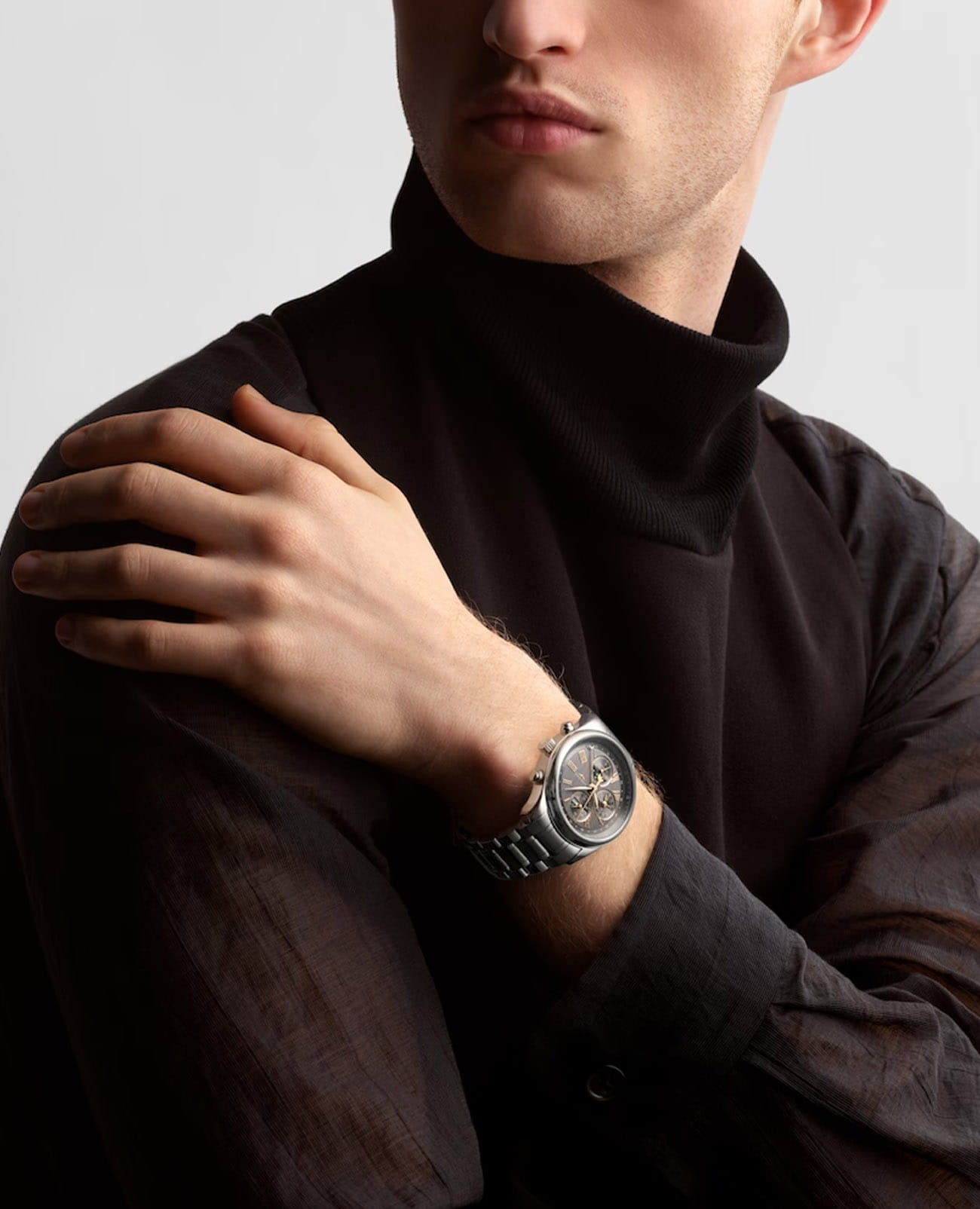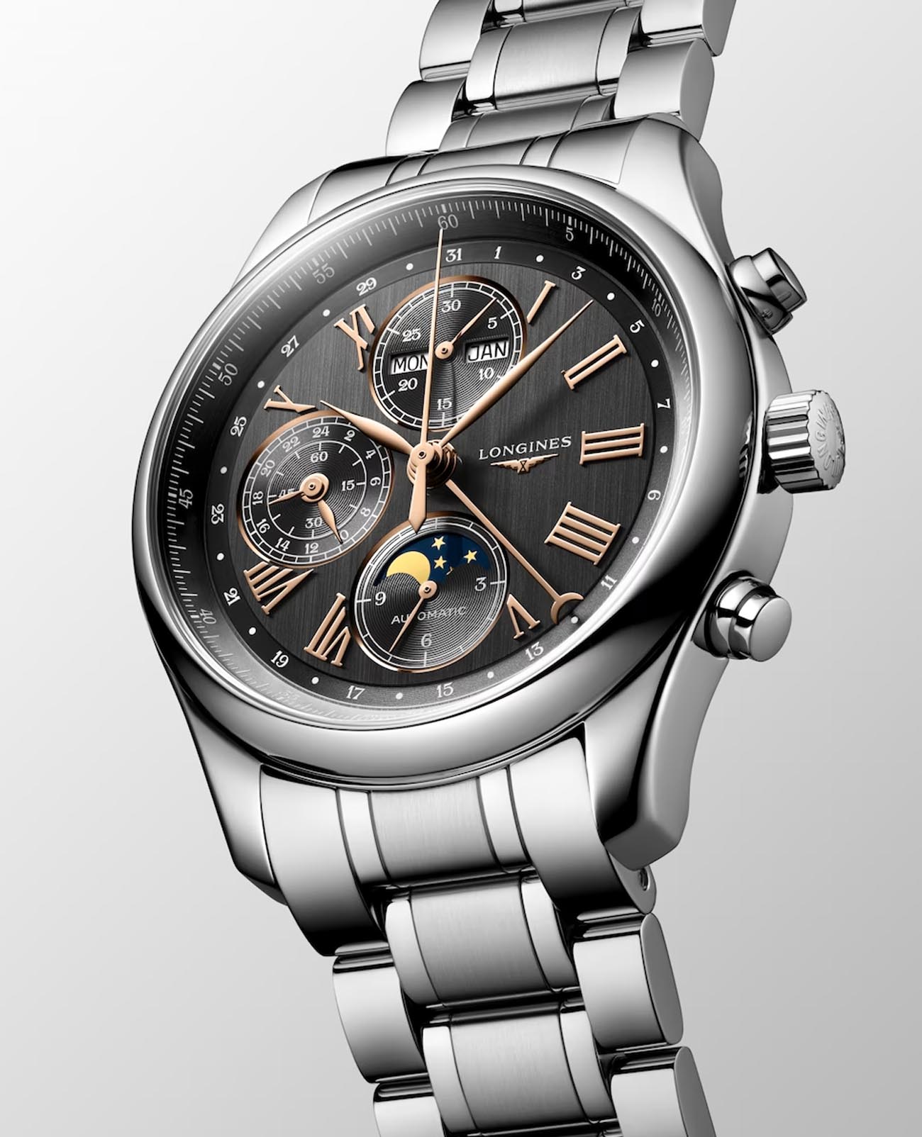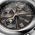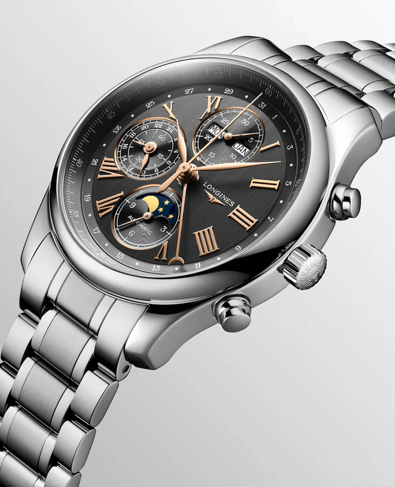 Мужсике швейцарские механические часы-хронографХронографФункция позволяет измерять отрезки времени с особой точностью: часы, минуты, секунды. Верным признаком хронографа является наличие на циферблате 3 дополнительных окошек-счётчиков. с автоподзаводом Longines Master Collection L2.773.4.61.6. Сапфировое стеклоСапфировое стеклоПрочный и надёжный материал из кристалла сапфира синтетического происхождения, характеризующийся особой твёрдостью и устойчивостью к царапинам и повреждениям. устойчивое к появлению царапин, обладающее высокой прозрачностью. Корпус часов изготовлен из нержавеющей стали. Функции: часы, минуты, малая секундная стрелка с 24-часовым индикатором в положении 9 часов. Дату показывает центральная стрелка с серповидным наконечником. Указатель фаз Луны в положении 6 часов. Прозрачная задняя крышка. Класс водозащиты: 30 метров, позволит защитить корпус от случайных брызг или капель дождя. Стальной браслет на застёжке «бабочка» с кнопкамиЗастёжка "бабочка"Такой вид застёжки дополняется предохранителями, помогающими избежать случайного раскрытия браслета. Обладают изящным исполнением. .